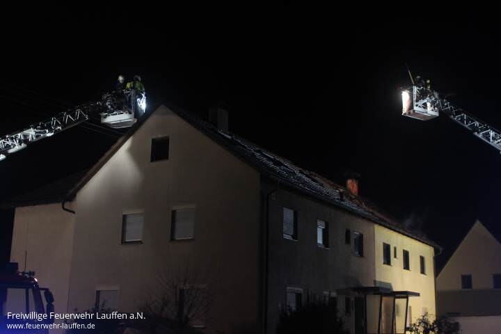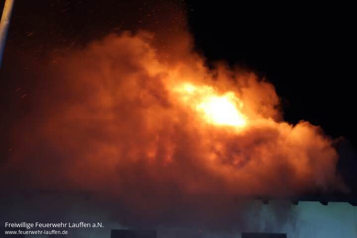 Nachdem das HLF als erstes Löschfahrzeug an der Einsatzstelle eingetroffen war, wurde mit dem ersten Rohr eine Riegelstellung zum Nachbarhaus in Stellung gebracht. Mit dem zweiten und dritten Rohr gingen zwei Trupps unter Atemschutz zur Brandbekämpfung ins OG und soweit möglich ins Dachgeschoss vor. Parallel dazu wurde die Drehleiter in Stellung gebracht, um die restliche Dachhaut zu öffnen, damit Hitze und Rauch abziehen konnten. Gleichzeitig wurde über die Drehleiter auch von Außen mit der Brandbekämpfung begonnen. Von der Besatzung des TLF wurde die Wasserversorgung für die Drehleiter aufgebaut sowie eine kombinierte Riegelstellung und Brandbekämpfung auf der Rückseite des Gebäudes vorgenommen. Ebenfalls auf der Rückseite des Gebäudes wurde die Drehleiter aus Lauffen eingesetzt. Die Besatzung übernahm dort die Riegelstellung und Brandbekämpfung von oben und unterstützte damit die Kameraden des TLF.