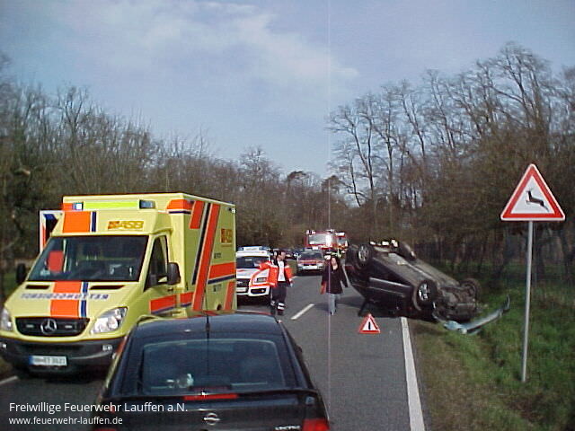 Das TLF 16/25 der FFW Talheim war innerhalb von Minuten als erstes vor Ort. Aus unbekannten Gründen, kam ein Erdgas betriebenes Fahrzeug im Kurvenbereich nach dem Wald von der Fahrbahn ab, und überschlug sich.