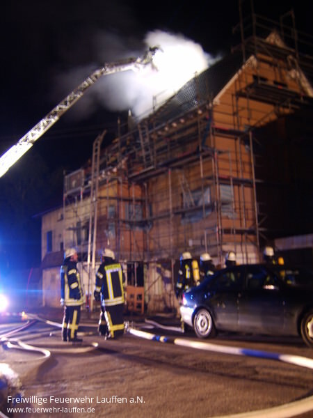 Vor Ort brannte der Dachstuhl eines noch im Bau befindlichen Gebäudes. Personen waren entgegen der ursprünglichen Meldung keine mehr in Gefahr. Mittels Riegelstellungen wurde ein Übergreifen auf das direkt angebaute und bewohnte Wohnhaus verhindert. Über mehrere Rohre im Innenangriff sowie die Lauffener Drehleiter wurde das offene Feuer bekämpft. Eine weitere Drehleiter zur Brandbekämpfung wurde nachgefordert. Die Feuerwehr Heilbronn übernahm nach Eintreffen daraufhin einen rückwärtigen Angriff. Im Innenangriff wurde permanent brennende Isolierung abgelöscht.