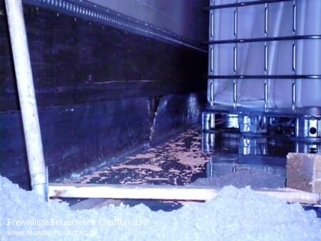 Von der örtlichen Feuerwehr wurden die Kanaleinläufe auf dem Betriebshof gesichert, damit keine Flüssigkeit in die Kanalisation gelangen konnte.