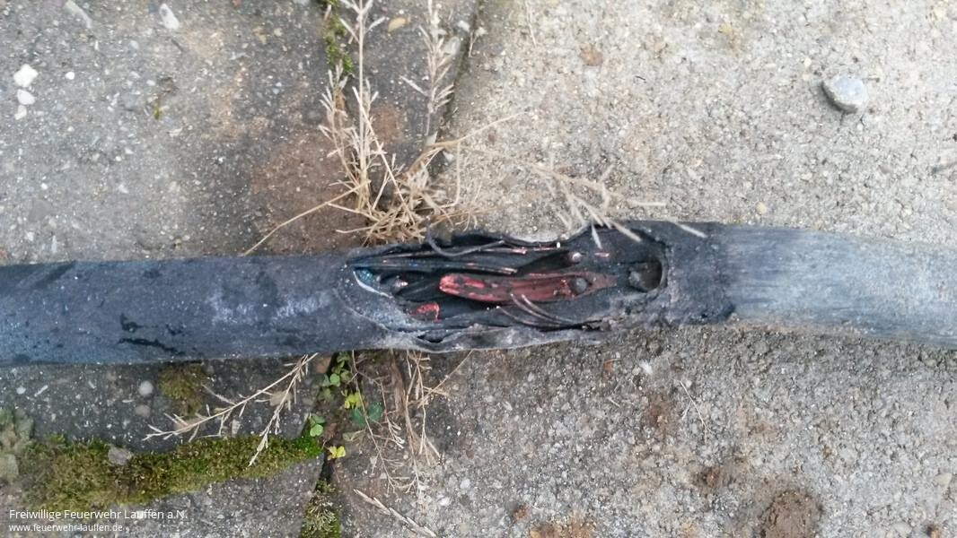 Der eingetroffene Stromversorger hat dann die Einsatzstelle übernommen und zur Fehlerbehebung mit Grabearbeiten begonnen. Wie sich herausstellte, ist die Zuleitung an der Gebäudewand, vermutlich durch eine Bodenabsenkung abgeknickt und hat den Kurzschluss verursacht.
