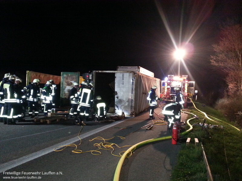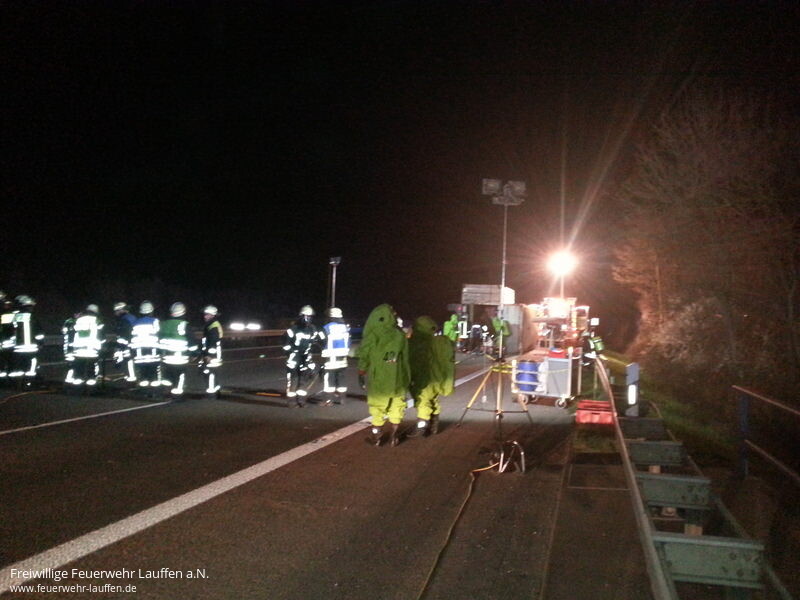 Nach der Alarm- und Ausrückeordnung werden bei Unfällen mit gefährlichen Stoffen und Gütern gleich mehrere Feuerwehren alarmiert. Neben der Feuerwehr Ilsfeld alarmierte die integrierte Leitstelle in Heilbronn die Feuerwehr Lauffen mit dem Gerätewagen-Messtechnik, den Gefahrgutzug der Feuerwehr Weinsberg, den Fachberater Chemie des Landkreises Heilbronn sowie den Kreisbrandmeister. Nach dem Eintreffen der ersten Einsatzkräfte an der Einsatzstelle wurde die Autobahn für den Verkehr voll gesperrt. Der Gefahrenbereich wurde abgesperrt und der Brandschutz sichergestellt. Zur weiteren Lageerkundung musste der Anhänger mit hydraulischem Rettungsgerät geöffnet werden. Auf Grund der im Anhänger umgestürzten Ladung ließ sich das Rolltor des Anhängers nicht vollständig öffnen. Die eingesetzten Kräfte waren mit umluftunabhängigen Atemschutzgeräten ausgerüstet. Zusätzlich gingen zwei Trupps mit einem Chemikalienschutzanzug zur Lageerkundung vor. Durch den Fachberater Chemie wurden mehrere Messungen vorgenommen und das Belüften des Anhängers angewiesen.