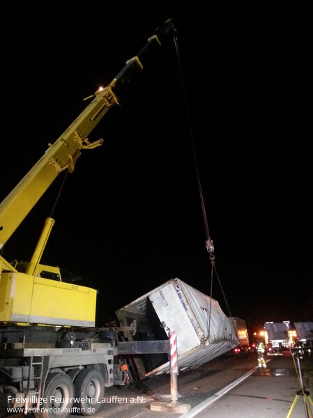Bereits um 19:50 Uhr ereignete sich nach Angaben der Polizei der Unfall, bei dem ein Anhänger eines Lastwagens umstürzte und auf der Fahrbahn liegen blieb. Zum Unfall kam es, da ein bislang noch unbekannter Autofahrer unmittelbar vor dem Lastwagen mit Anhänger vom mittleren auf den rechten Fahrstreifen wechselte. Der Lastwagenfahrer musste daraufhin stark bremsen und kam ins Schlingern. Zunächst prallte der Anhänger gegen die rechte Schutzplanke, wurde anschließend nach links gegen die dortige Schutzplanke abgewiesen und stürzte um.