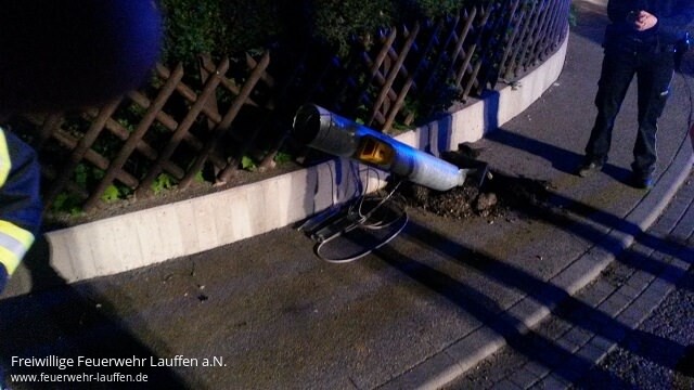 Beim Eintreffen der Einsatzkräfte war die Örtlichkeit bereits durch eine Polizeistreife und einen Mitarbeiter der Straßenmeisterei abgesichert. Der Ausleger mit der Lichtzeichenanlage ragte bei dem in Schräglage befindlichen Ampelmasten in die Fahrbahn der Ilsfelder Straße hinein.