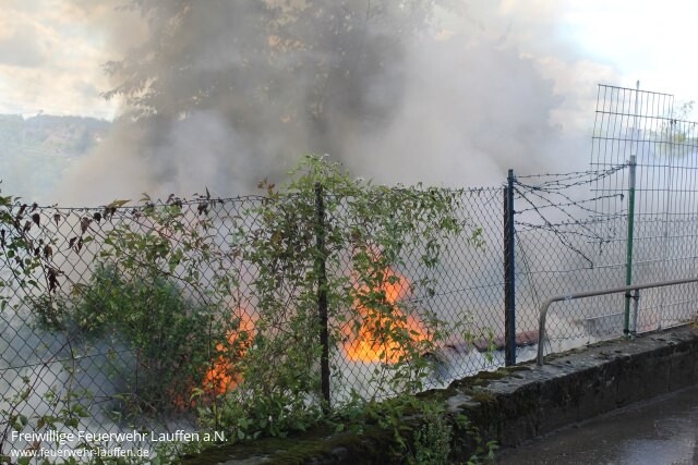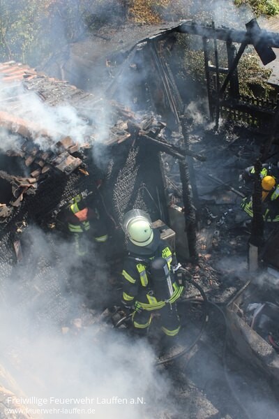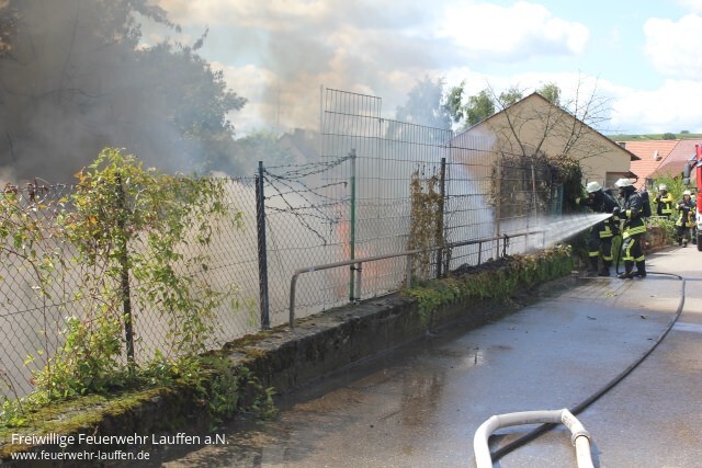 Schon auf der Anfahrt zu Einsatzstelle war eine schwarze Rauchsäule über die Grenzen von Lauffen hinaus zu sehen. Beim Eintreffen der Wehr wurde diese bereits von den Bewirtschaftern des Gartengrundstücks empfangen und darauf hingewiesen, dass sich in der im Vollbrand befindlichen Gartenhütte, mehrere Gasflaschen befinden würden.
