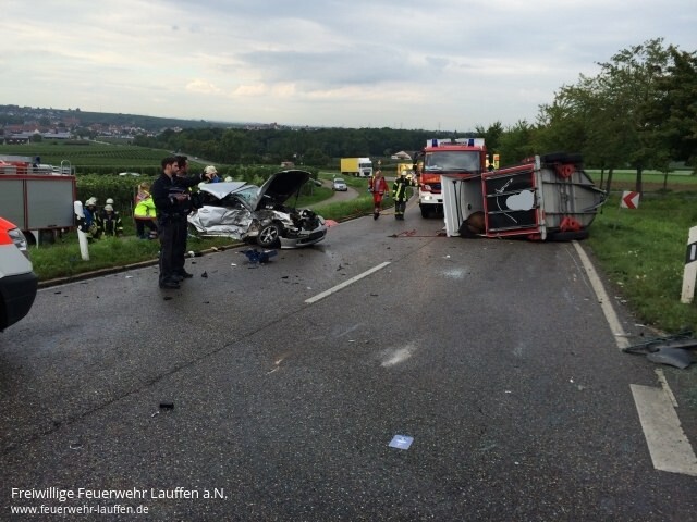 Beim Eintreffen an der Einsatzstelle konnten zwei verunfallte Fahrzeuge und ein auf die Bundesstraße umgestürzter Pferdeanhänger festgestellt werden.