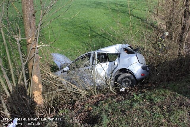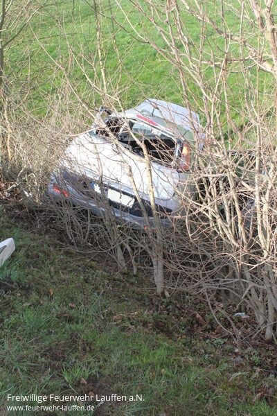 Beim Eintreffen der Feuerwehren an der Einsatzstelle konnte ein PKW festgestellt werden, welcher in auf der K 2156 in Fahrtrichtung Ilsfeld in einer Linkskurve nach rechts von der Fahrbahn abgekommen und einen kleinen Abhang hinunter gerutscht ist. Hierbei hat der PKW diverse Sträucher und einen Baum touchiert.
