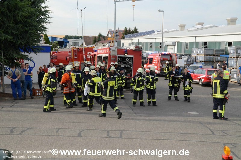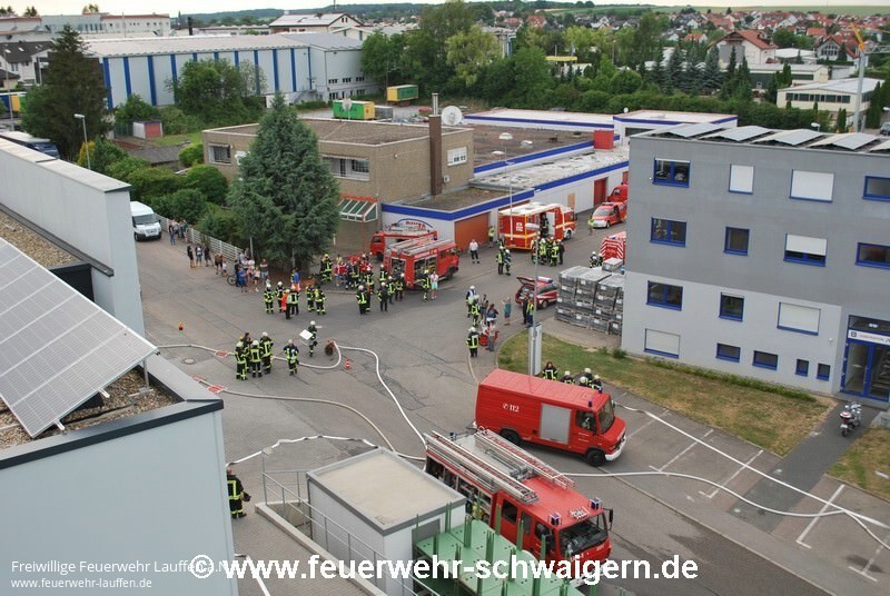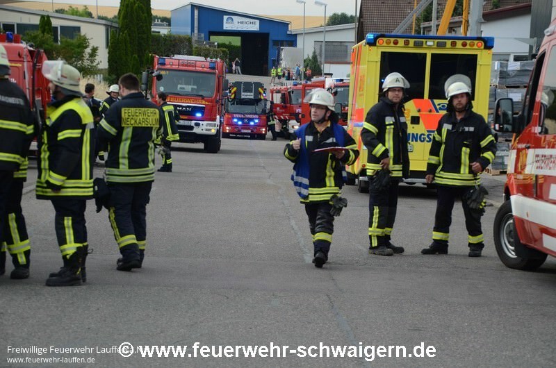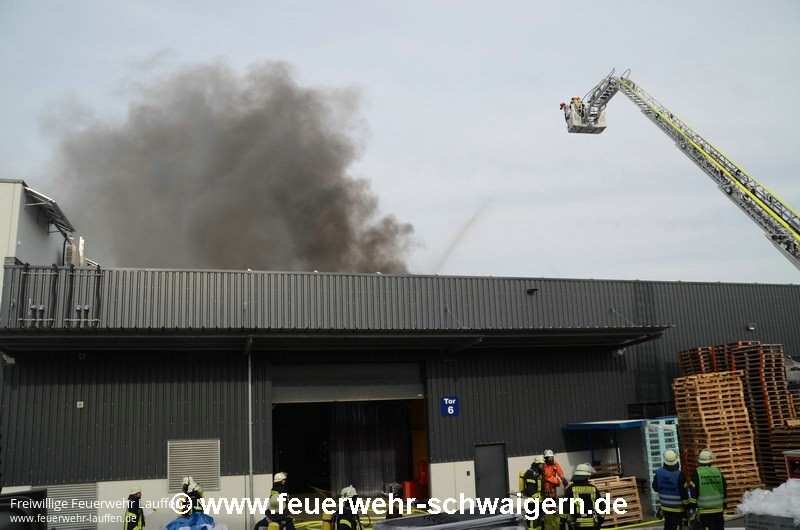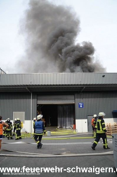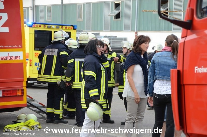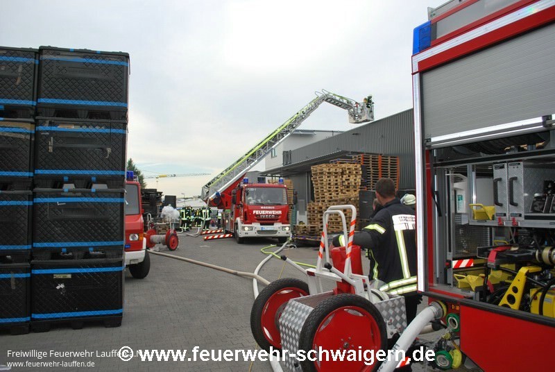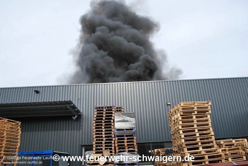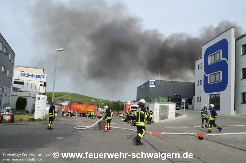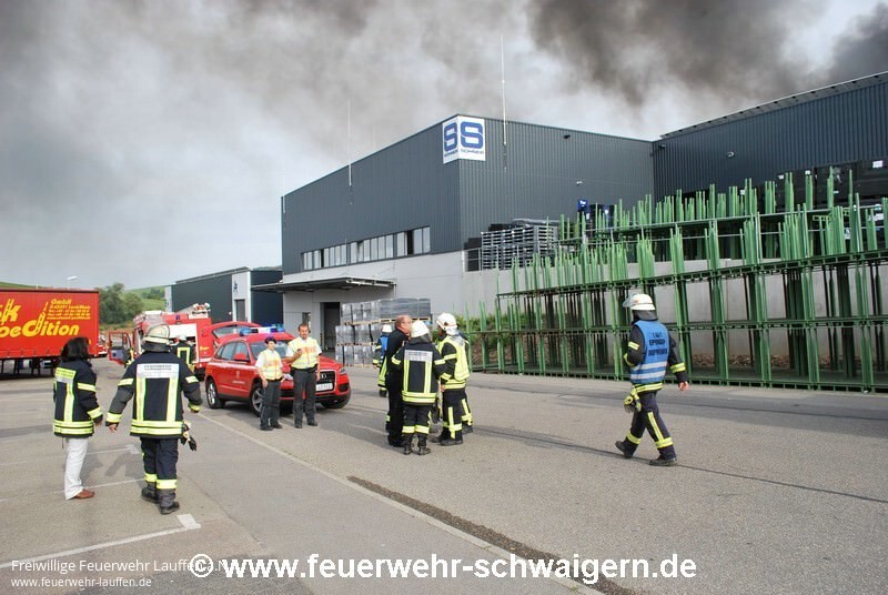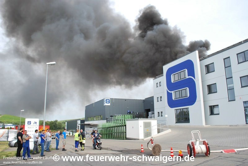 Die Feuerwehr Schwaigern war durch die automatische Brandmeldeanlage zur Firma Söhner Kunststofftechnik im Schwaigerner Industriegebiet alarmiert worden. Bereits auf der Anfahrt zum Feuerwehrhaus war für die alarmierten Einsatzkräfte eine dichte Rauchwolke über dem Industriegebiet zu sehen.