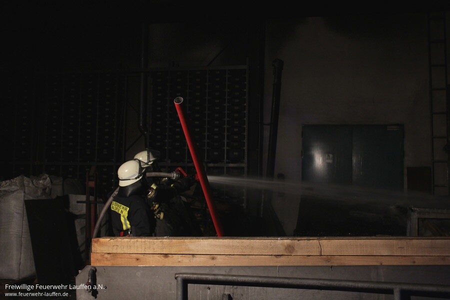 Um Löscharbeiten im Bereich der Maschinenhalle durchführen zu können, musste zuvor das Hallentor mit schwerem Gerät aufgesägt werden um einen Zugang zu erhalten. Der Bürobereich im Gebäude, welcher auch verraucht war, konnte über die Gebäuderückseite durch die Feuerwehr Eppingen erkundet und abschließend belüftet werden. Durch die Drehleiter der Lauffener Wehr wurde eine Riegelstellung zum Schutz des angrenzenden Autohauses gestellt, während durch die Kräfte der Heilbronner Drehleiter ein Löschangriff über das Dach erfolgte. Erschwerend gestaltete sich die Wasserversorgung durch den vorhandenen Wasserdruck im Industriegebiet, weshalb umgehend eine Druckerhöhung beim Wasserversorger angefordert worden ist. Unterstützend wurde mit dem Schlauchwagen eine doppelte Schlauchleitung vom Hydranten an der angrenzenden Landstraße verlegt. Hierzu musste die Landstraße über einen längeren Zeitraum für den Verkehr gesperrt werden.