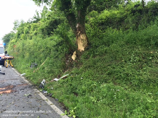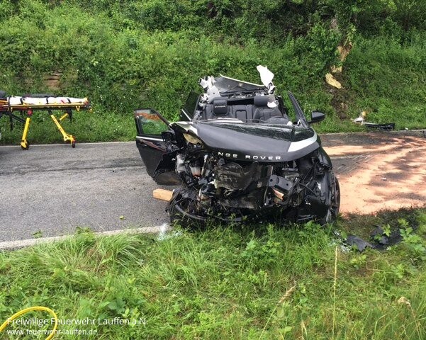 befreit werden. Bisherigen Erkenntnissen zufolge befuhr die Frau gegen 15 Uhr mit ihrem Range Rover Evoque die Kreisstraße 2155 von der Waldkreuzung in Richtung Talheim und überholte einen vorausfahrenden PKW. Beim Wiedereinscheren geriet sie mit ihrem Geländewagen auf das unbefestigte Bankett, worauf dieser ins Schlingern geriet. Die Fahrerin verlor schließlich die Kontrolle über das Fahrzeug, das nach rechts von der Fahrbahn abkam und dort gegen eine Böschung sowie einen Baum prallte. Die Fahrerin wurde eingeklemmt und von der Feuerwehr, die mit insgesamt 20 Mann im Einsatz war, aus dem Fahrzeug befreit. Da zunächst unklar war, ob weitere Personen beim Unfall verletzt wurden, fuhren zwei Rettungswagen dorthin. Ferner befanden sich ein Notarzt sowie ein Rettungshubschrauber im Einsatz, mit dem die Schwerverletzte ins