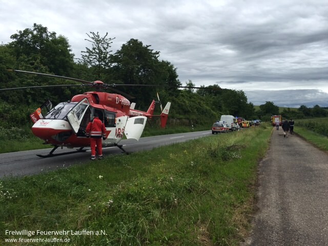 Die anwesende Notärztin entschied nach ihrer ersten Lageerkundung dass die Patientin nicht auf dem Bodengebunden Weg ins Krankenhaus verbracht werden konnte. Der Rettungshubschrauber Christoph 51 der DRF wurde nachalarmiert und kam kurz darauf an der Unfallstelle an. Hierzu musste die Straße von der Feuerwehr abgesperrt werden.