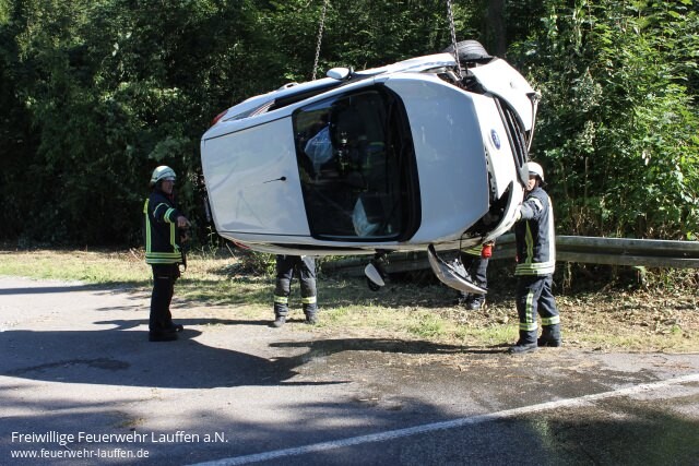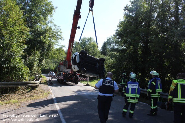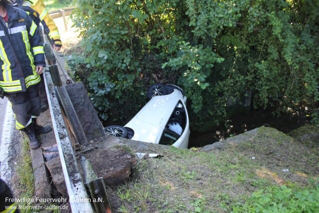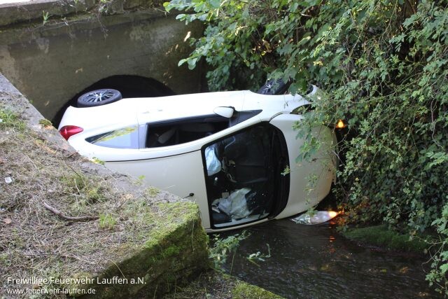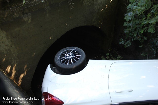 Aus bisher ungeklärter Ursache ist ein PKW nach einer Linkskurve von der Fahrbahn der K 2074 abgekommen, über eine dortige Leitplanke gerutscht und schließlich in Seitenlage vor der Brücke im Bachbett des Neipperger Bächle auf der Seite liegen geblieben.