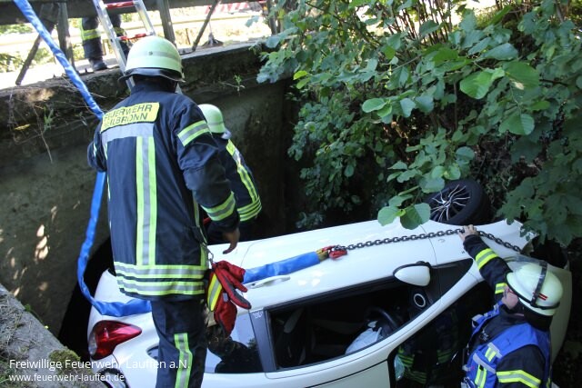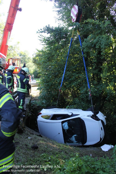 Recht schnell konnte der PKW dann mit dem Feuerwehrkran aus dem Bachbett geborgen und für den weiteren Abtransport auf einem Feldweg abgesetzt werden. Die wenigen in den Bach und auf die Fahrbahn ausgelaufenen Betriebsstoffe wurden mit Ölsaugmatten aufgenommen.