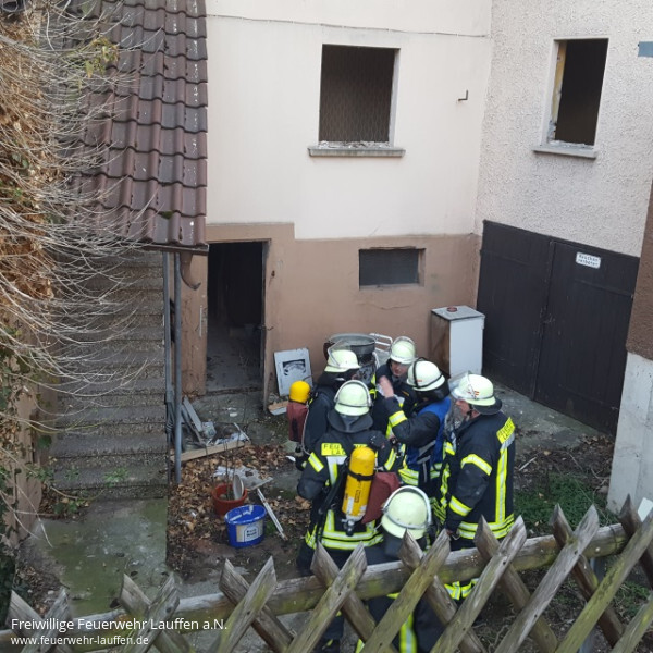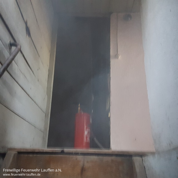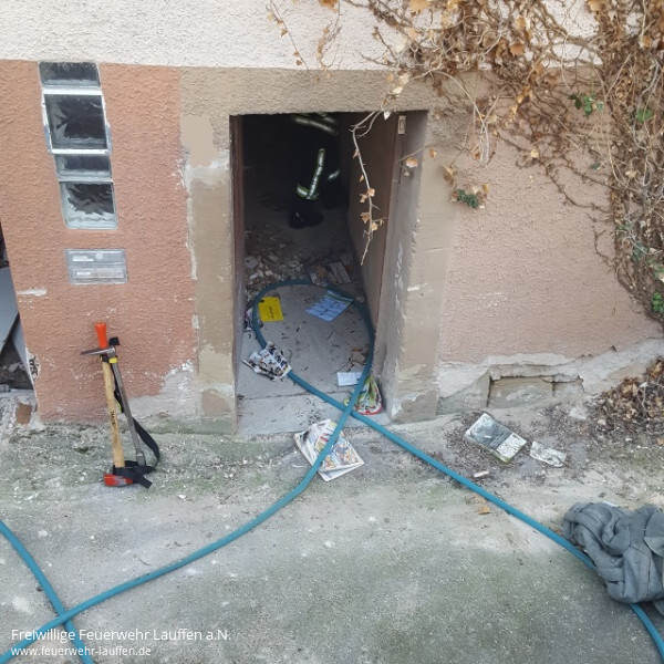 Von einem Trupp unter Atemschutz erfolgte dann mit der Kübelspritze eine punktuelle Brandbekämpfung von in Brand geratener Kleidung. Da nach dem Ablöschen der Kleidung noch immer eine Rauchentwicklung feststellbar war, erfolgte eine weitere Suche im mehrfach verwinkelten Gebäude. Hierzu musste am Gebäude eine weitere Türe geöffnet werden. In einem Raum im Erdgeschoss wurde dann ein brennender Stoss Zeitungen und Papier entdeckt. Mit der Schnellangriffeinrichtung des HLF erfolgte dann das Ablöschen des Brandherdes. Zeitgleich wurde eine Überdruckbelüftung des Untergeschoss durchgeführt.