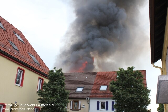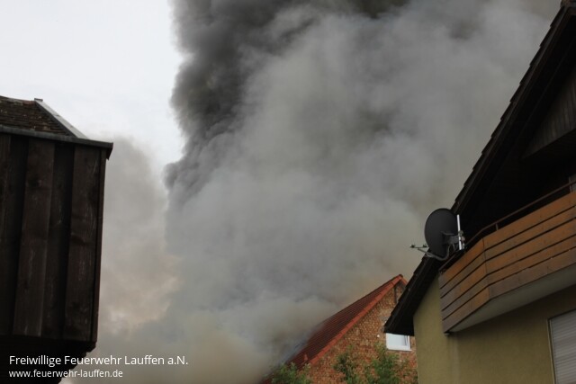 Zu einem Gebäudebrand wurde die Feuerwehr Lauffen in den frühen Abendstunden in die Seugenstraße alarmiert. Bereits auf der Anfahrt zum Feuerwehrhaus, war eine dichte schwarze Rauchwolke weit über Lauffen sichtbar.