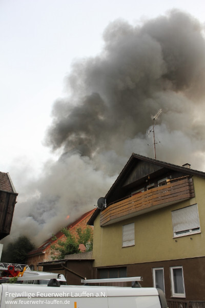 Da es sich bei dem Gebäude um ein zusammengebauten Scheunenkomplex mit einer angrenzenden Wohnfläche handelt, zum Glück aber alle Bewohner und Anwohner bereits ihre Gebäude verlassen hatten, konnte durch das HLF unmittelbar mit einem Löschangriff im im Innen- und Außenangriff begonnen werden. Über die Drehleiter der Feuerwehr Lauffen erfolgte zudem eine Riegelstellung von oben, um ein Überggreifen der Flammen auf den Wohnbereich zu verhindern. Kräfte des TLF führten von der Lindenstraße her ebenfalls eine Brandbekämpfung und Riegelstellung, unterstützt von den Kräften der Feuerwehr Heilbronn durch. Von der Feuerwehr Neckarwestheim erfolgte eine Überdruckbelüftung des angrenzenden Wohngebäudes und ein Löschangriff in einem weiteren Teil der Scheune. Glücklicherweise kam bei diesem Schadensereignis kein Mensch zu Schaden und es gelang der Feuerwehr Lauffen noch, Stallhasen lebend aus der brennenden Scheune zu retten. Durch den schnellen Löscheinsatz und die vorgenommene Riegelstellung, konnte eine Brandausbreitung auf die anderen Scheunenteile und den Wohnkomplex verhindert werden.