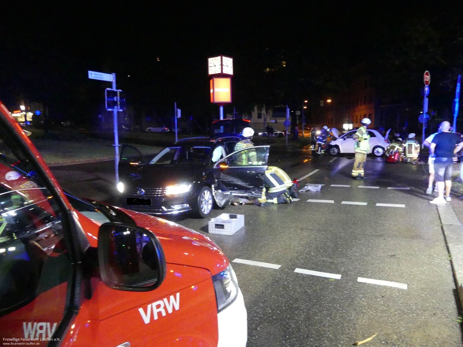Am Rathenauplatz war es zu einem Verkehrsunfall mit zwei verletzten Personen gekommen, bei dem die Feuerwehr die Erstversorgungsmaßnahmen durchführte.