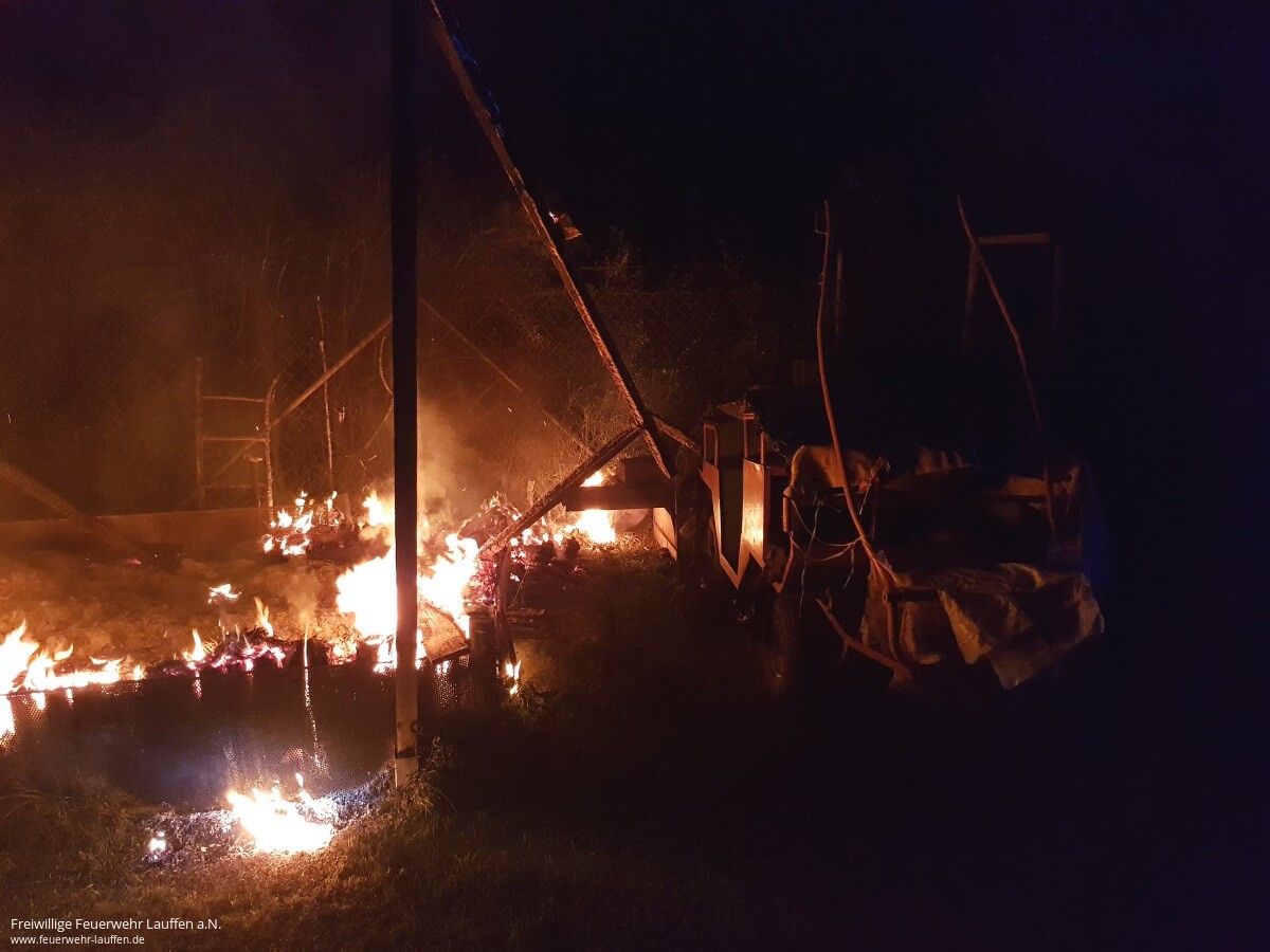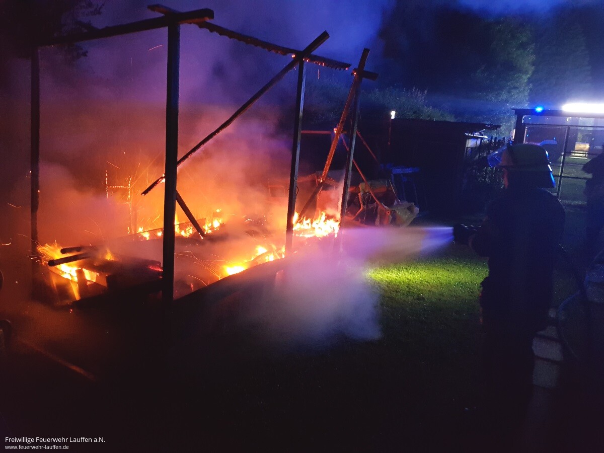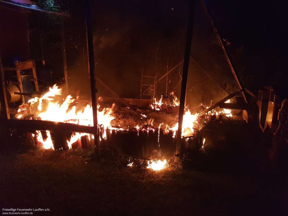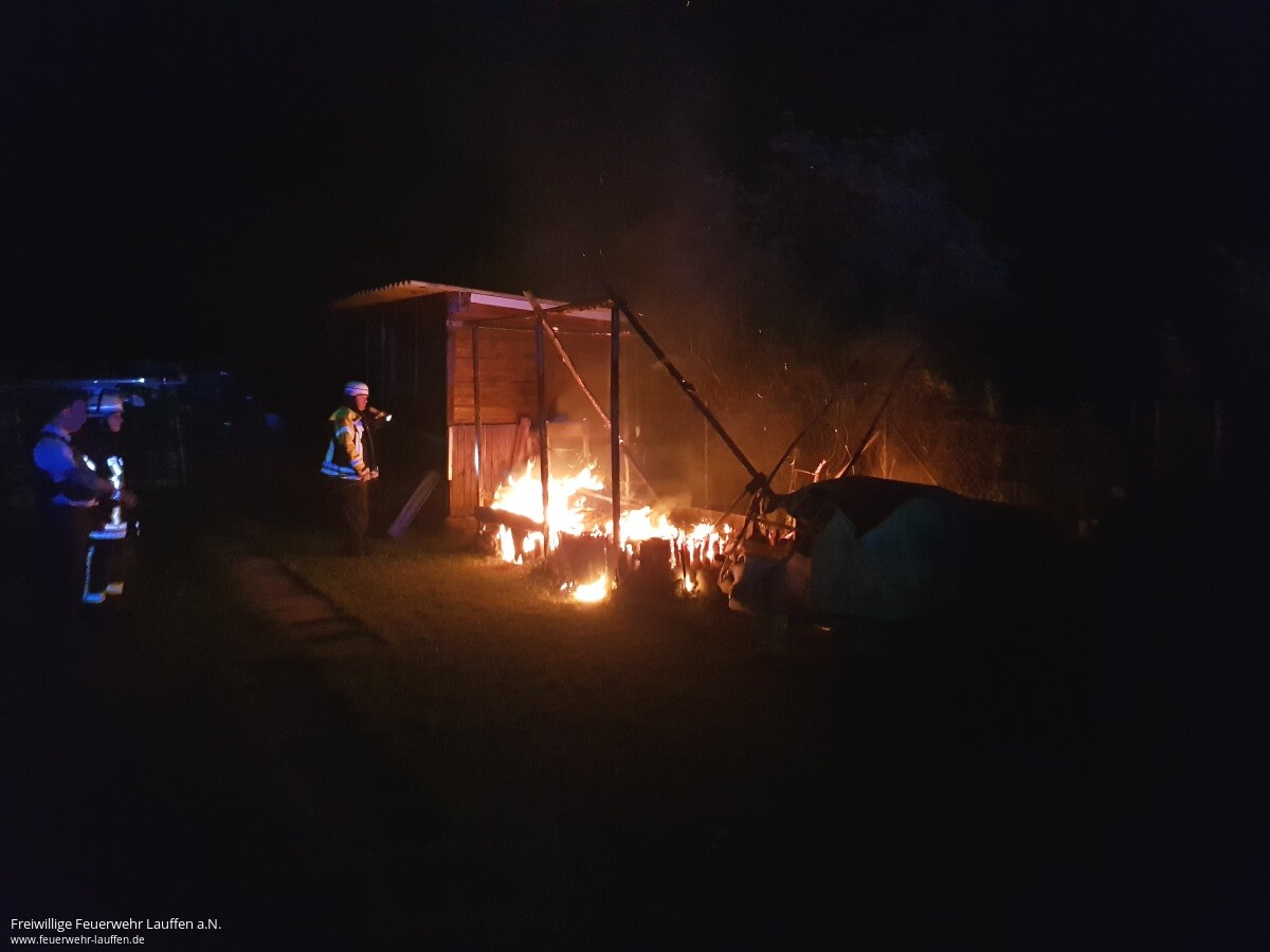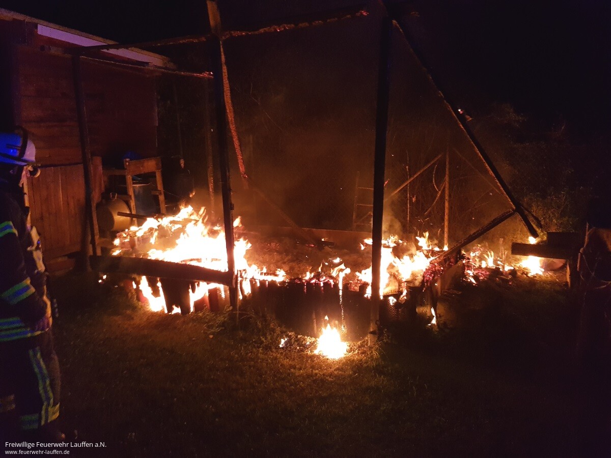 Durch Beamte des Polizeirevier Lauffen a.N. wurde bei einer Vorbeifahrt auf der L1103 bemerkt, dass offensichtlich ein Gartenhäuschen im Bereich des „Lauerbrückle“ in Brand stand. Ein Vordringen auf das Grundstück, zur Einleitung erster Maßnahmen, war für die Polizei nicht möglich, da das Gartengrundstück von einem hohen Zaun mit Stacheldraht gesichert war.