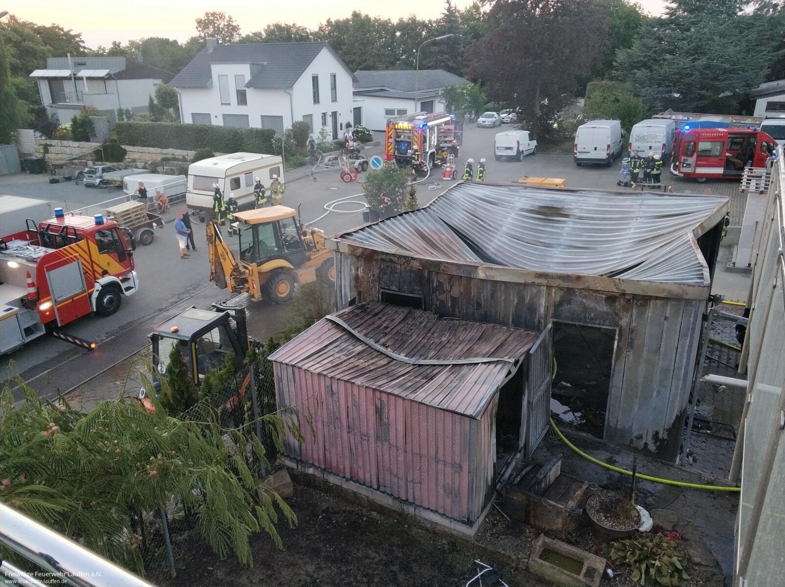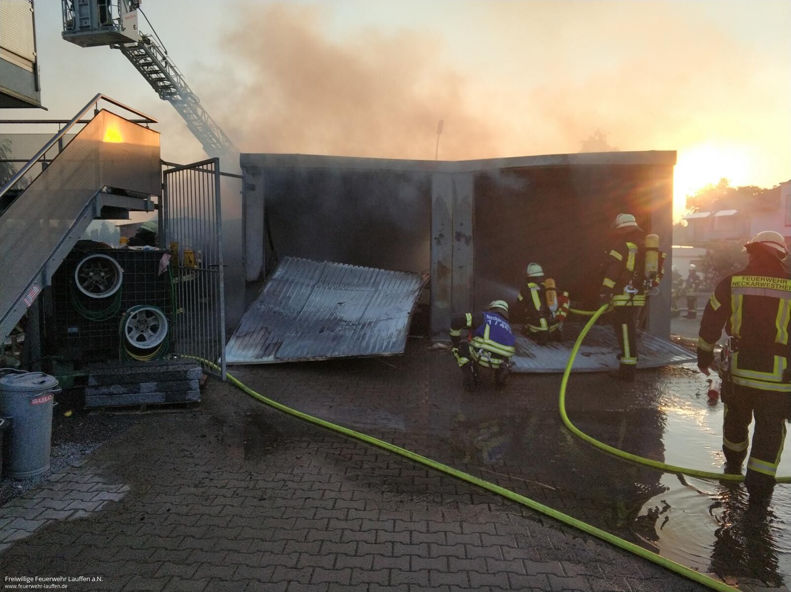 Am Freitagabend wurden die Feuerwehren Neckarwestheim und Lauffen zu einem Brand einer Doppelgarage und Geräteschuppens, der auf ein Gebäude überzugreifen drohte, alarmiert. Durch den Einsatzleiter wurde das angrenzende Gebäude geräumt und bei der Erkundung eine 11 kg Gasflasche in der brennenden Garage ausgemacht, welche durch abblasendes Gas die Temperaturen des Feuers in extreme Höhen trieb.