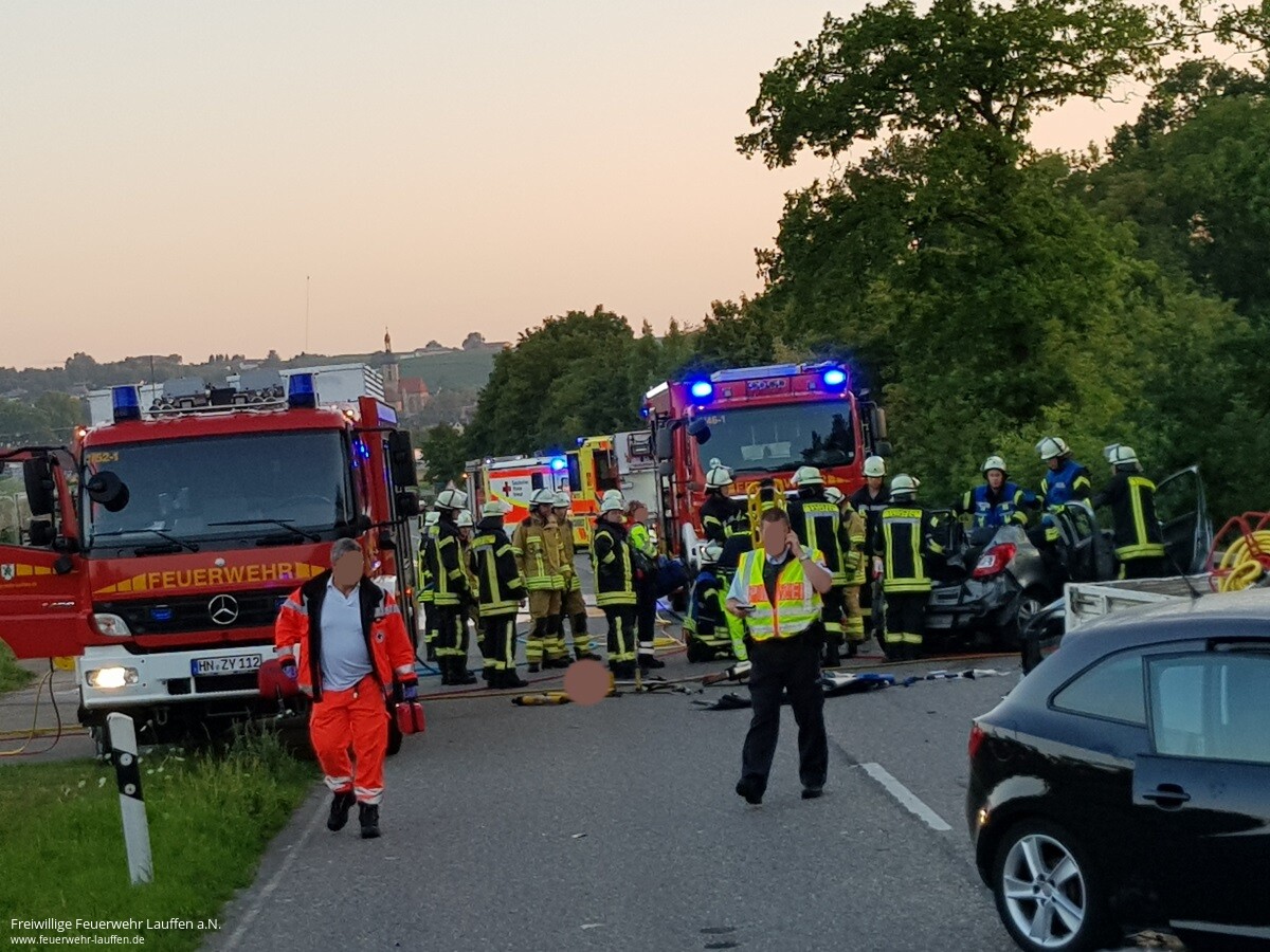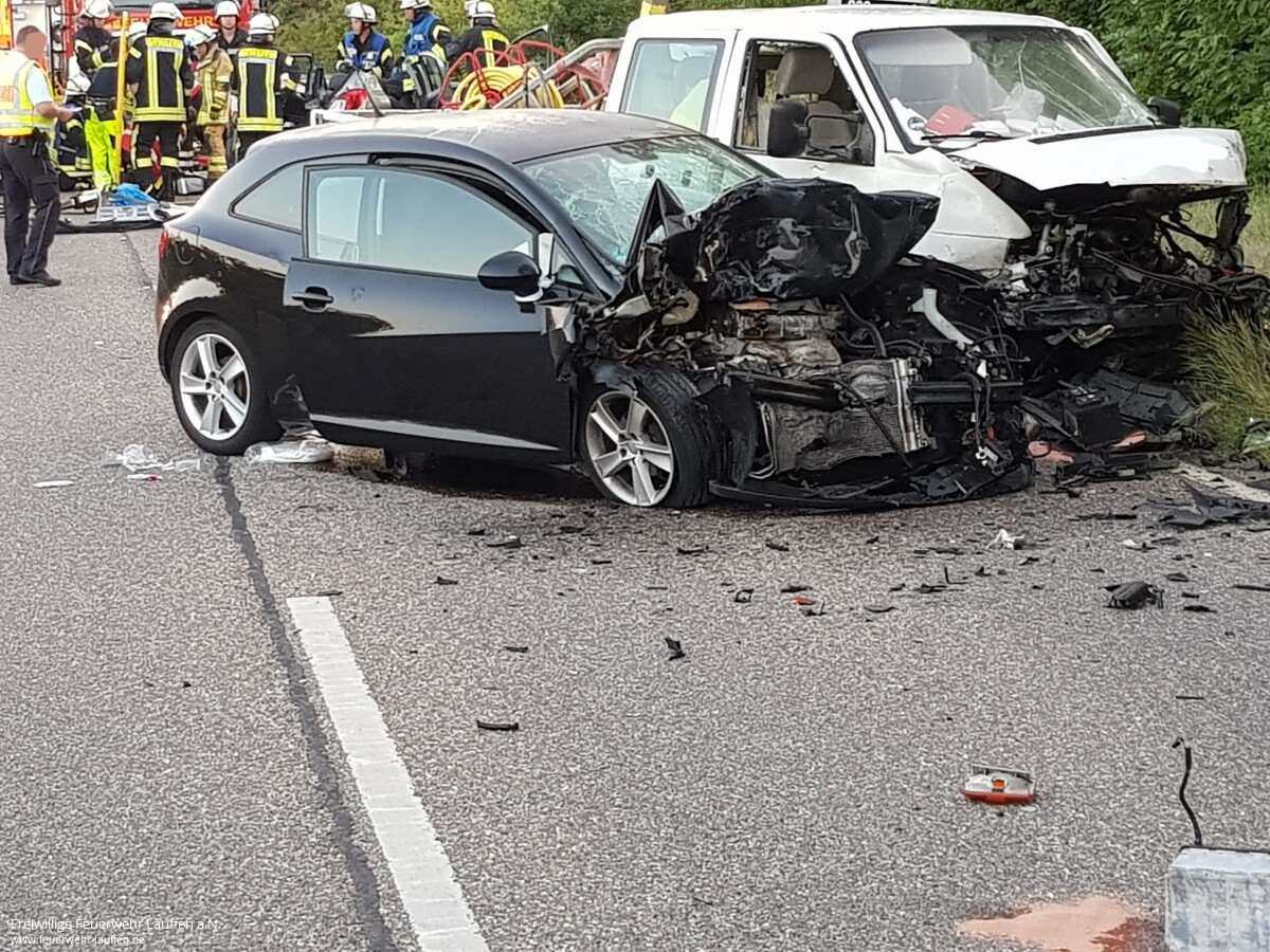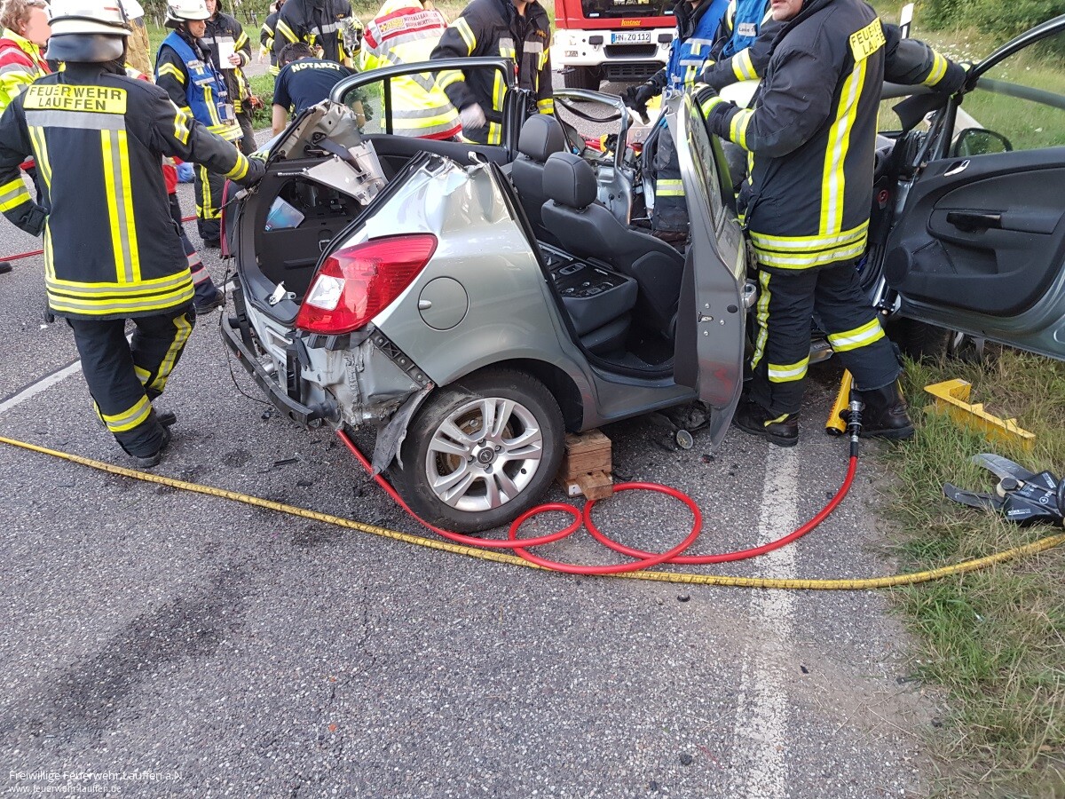 Beim Eintreffen des Einsatzleiters an der Einsatzstelle, bot sich diesem eine Unfalllage mit drei beteiligten Kraftfahrzeugen und einem Trümmerfeld von ca. 50 Meter Länge. Nach der Erkundung stand schnell fest, dass die verletzten Personen in einem PKW und einem VW-Pritschenwagen, nicht eingeklemmt waren und eigenständig vom Rettungsdienst aus den Fahrzeugen verbracht werden können. Beim dritten beteiligten PKW war eine Person im stark deformierten Fahrzeug eingeklemmt. Da es sich bei dieser Person um einen reanimationspflichtigen Person handelt, wurde in enger Koordnination zwischen Notarzt, Rettungsdienst und Feuerwehr eine Crashrettung eingeleitet. Unter gleichzeitiger Vornahme von hydraulischem Rettungsgerät aus dem Rüstwagen (RW) und dem Hilfeleistungslöschfahrzeug (HLF) und Reanimationsmaßnahmen im PKW, wurde die Person aus dem Fahrzeug befreit. Trotz der professionellen und schnellen Zusammenarbeit der Einsatzkräfte, verstarb die Person noch an der Unfallstelle. Während der Rettungsarbeiten wurde der Brandschutz sichergestellt und Personen betreut, welche als andere Verkehrsteilnehmer das Unfallgeschen beobachten mussten.