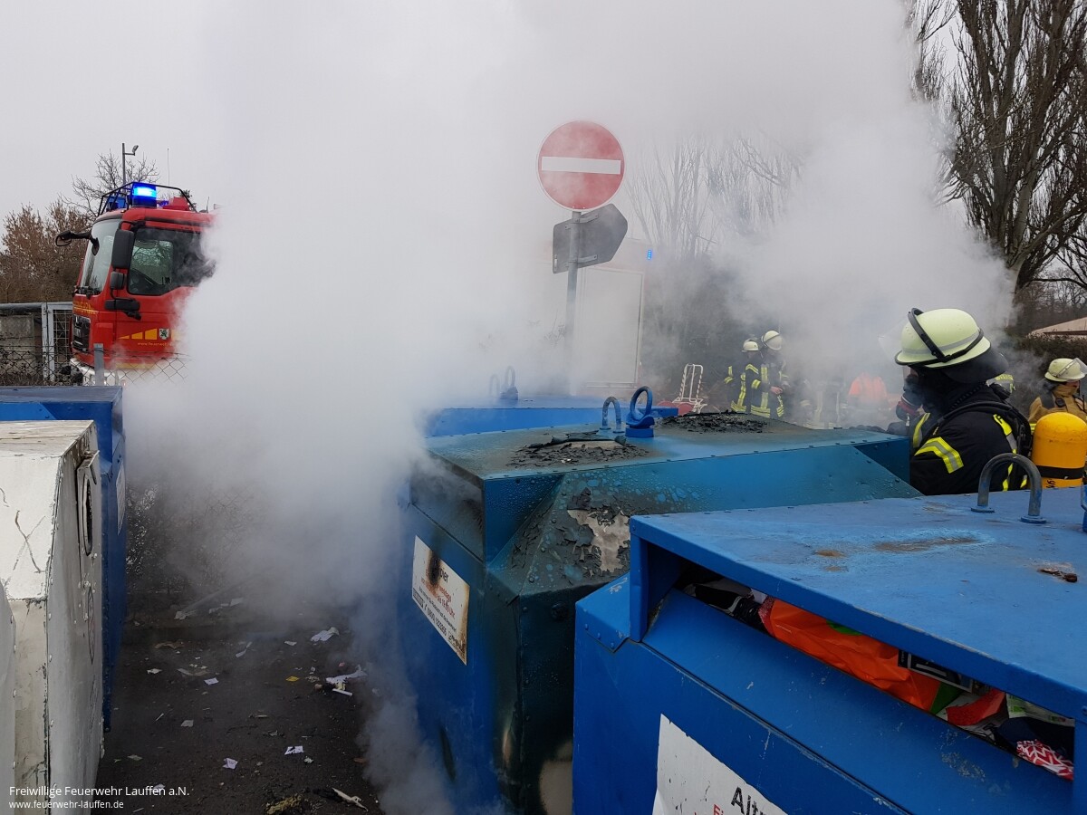 Schon auf der Anfahrt zum Recyclinghof war die Rauchentwicklung erkennbar. Beim Eintreffen an der Einsatzstelle waren neben dem Brandrauch auch deutlich Flammen durch die Einwurföffnungen zu erkennen.