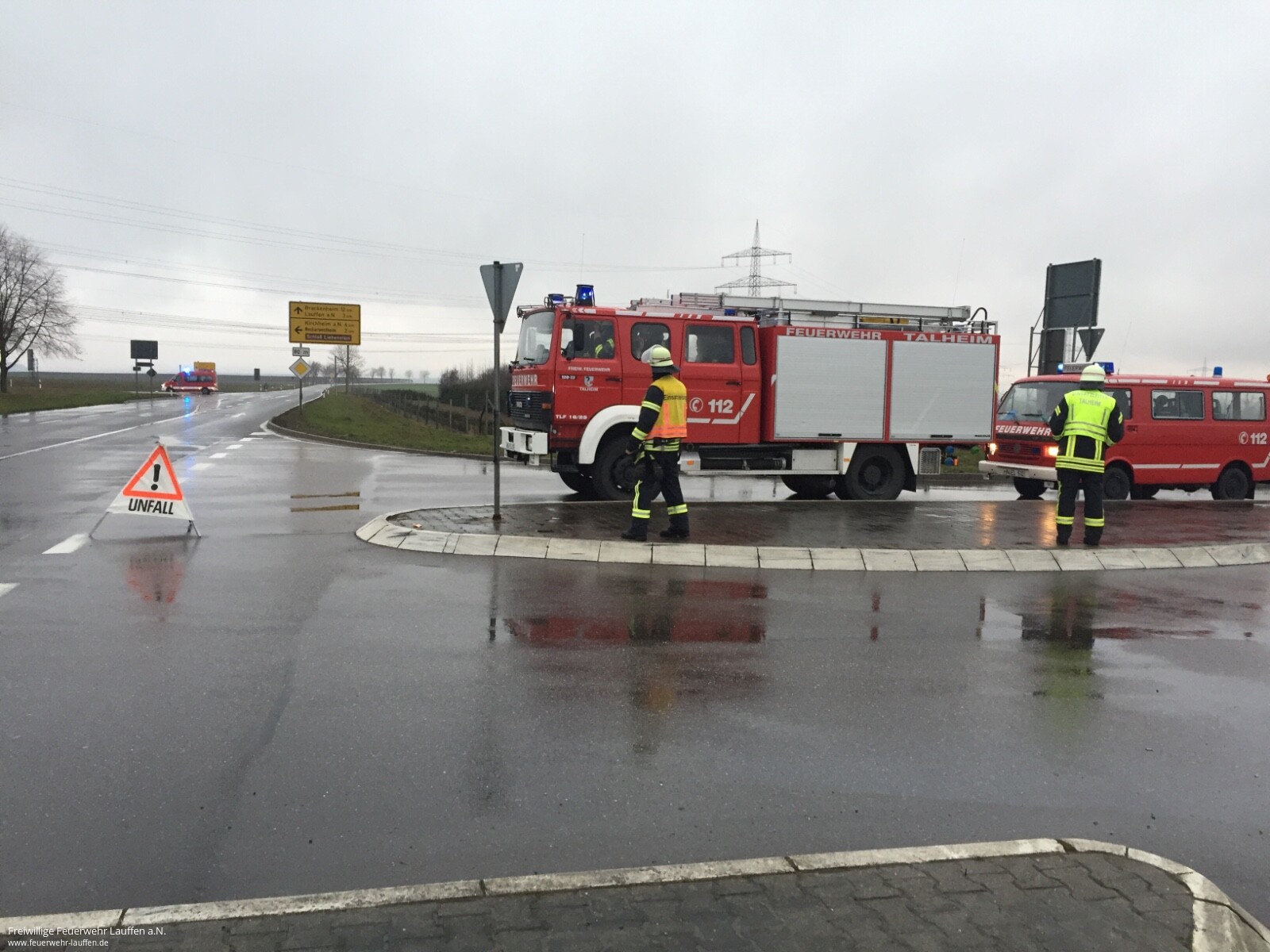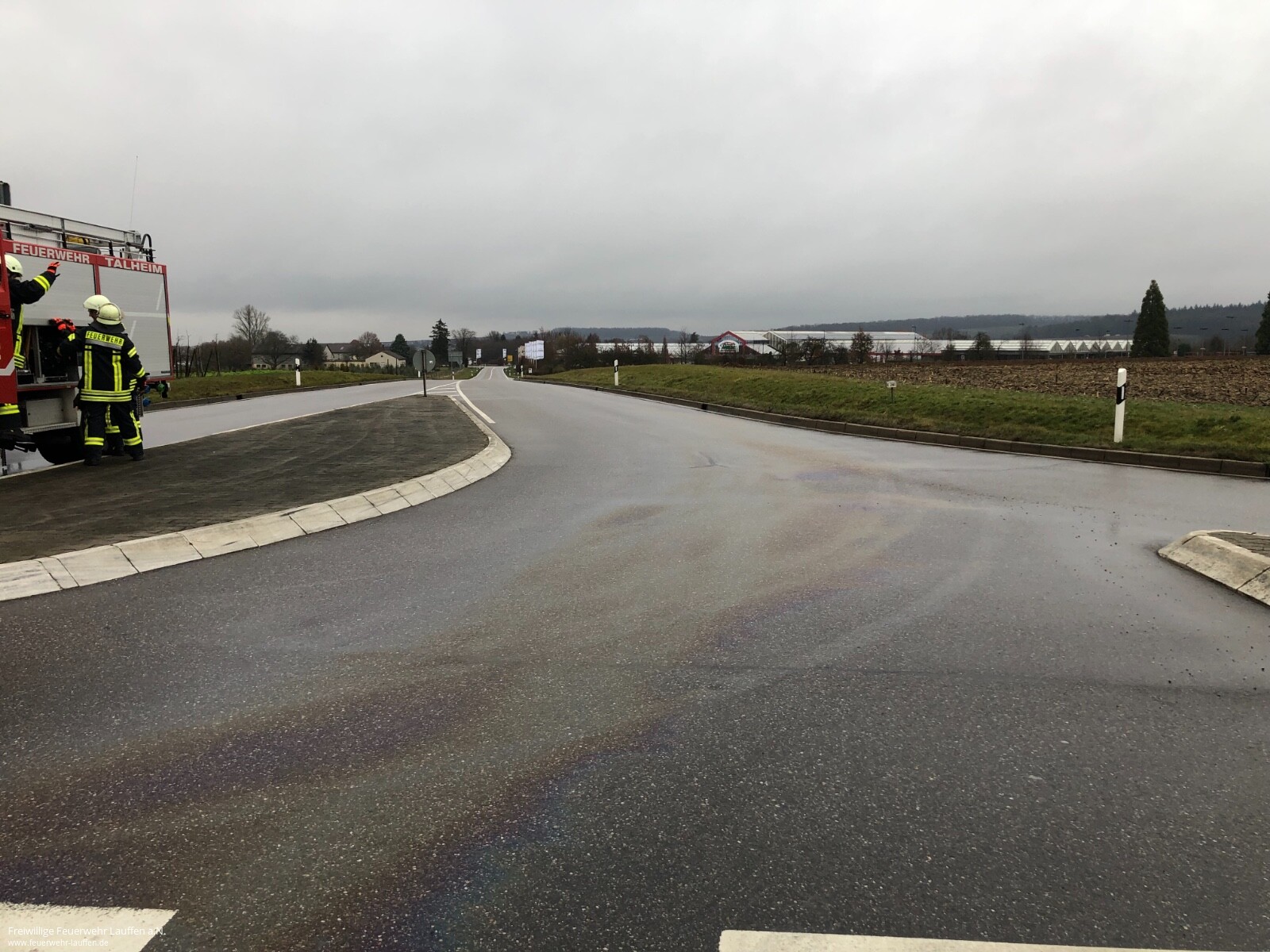 Zur Absicherung der Straßen und der Fachfirma waren die Feuerwehren aus Lauffen am Neckar, Neckarwestheim und Talheim mit 7 Fahrzeugen angerückt und an den Verkehrsknotenpunkten postiert. Der aufkommende Regen am Sonntagnachmittag sorgte dafür das die kleinen Tropfmengen noch während des Einsatzes von der Straße gespült wurden. Deswegen war ein Tätig werden der Fachfirma nur noch an den Kreuzungsbereichen und den Bereichen notwendig an denen das Fahrzeug viel Öl verloren hatte.