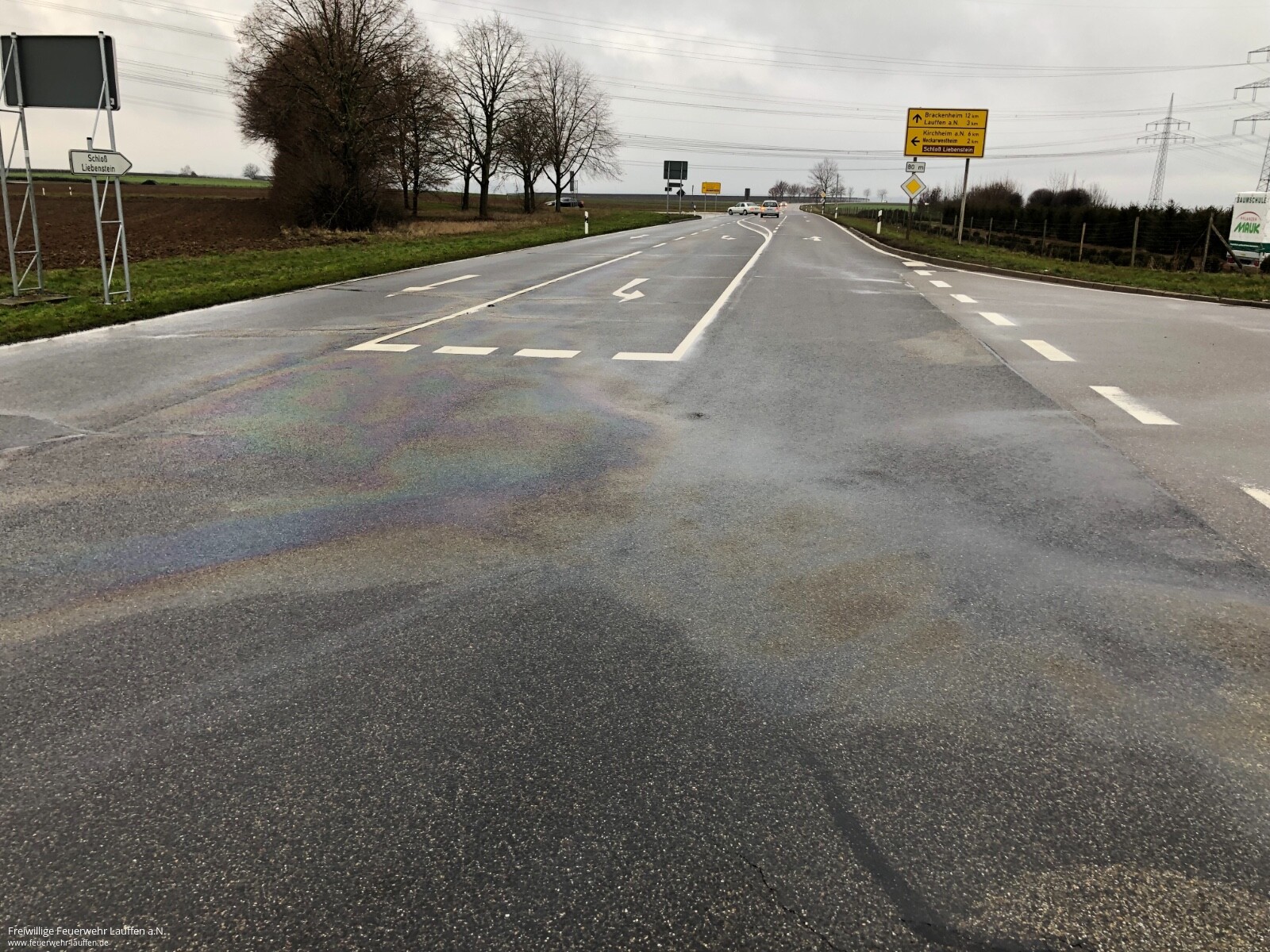 Der Fahrer eines VW Passat hatte einen Defekt an seinem Getriebe, welche dazu führte das Getriebeöl austrat. Beginnend unmittelbar nach der Ortsausfahrt von Neckarwestheim zog sich die Ölspur über die Kreuzung am Mauk Garten Center vorbei am Landturm bis hin nach Talheim in die Hofeinfahrt des Verursachers. Da die Reinigung auf dieser großen Strecke selbst für die Kräfte von drei Feuerwehren zu viel wäre und ohnehin nicht effektiv genug durchgeführt werden konnte, wurde eine Fachfirma mit der Reinigung des Fahrbahnbelages beauftragt.
