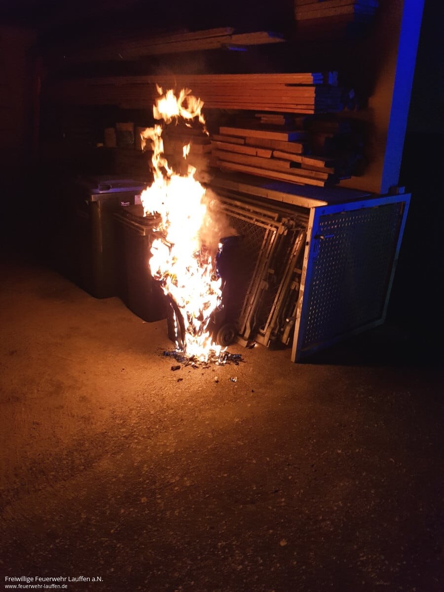 An der Einsatzstelle „Biomülltonne“ erfolgte noch eine Kontrolle der Tonne und der Gebäudewand mit der Wärmebildkamera, als über Funk eine weitere brennende Mülltonne durch Anwohner einer Straße in der Nachbarschaft zur Einsatzstelle gemeldet worden ist. Dort eingetroffen konnte tatsächlich in einem privaten Hof unter einem Lagerdach eine brennende Restmülltonne angetroffen werden. Das Müllgefäß brannte in voller Ausdehnung und das Feuer drohte auf die unter dem Lagerdach abgelagerten Holzbretter und Gerüstteile über zu greifen. Die Mülltonne wurde von den Brettern weggezogen und diese unmittelbar mit der Schnellangriffseinrichtung des HLF abgelöscht. Zudem wurde die Mülltonne entleert, der telweise auch schon in Brand geratene Müll abgelöscht und eine Kontrolle mit der Wärmebildkamera durchgeführt.