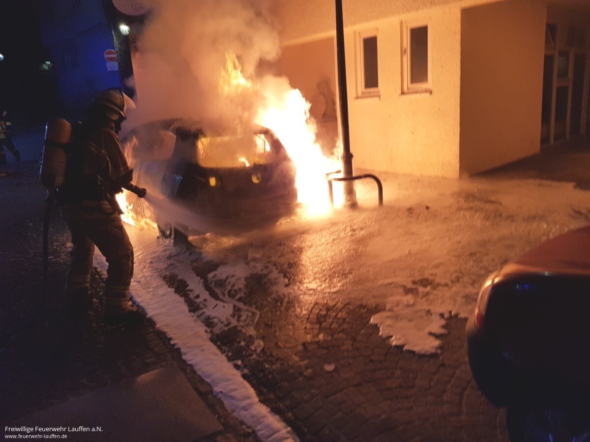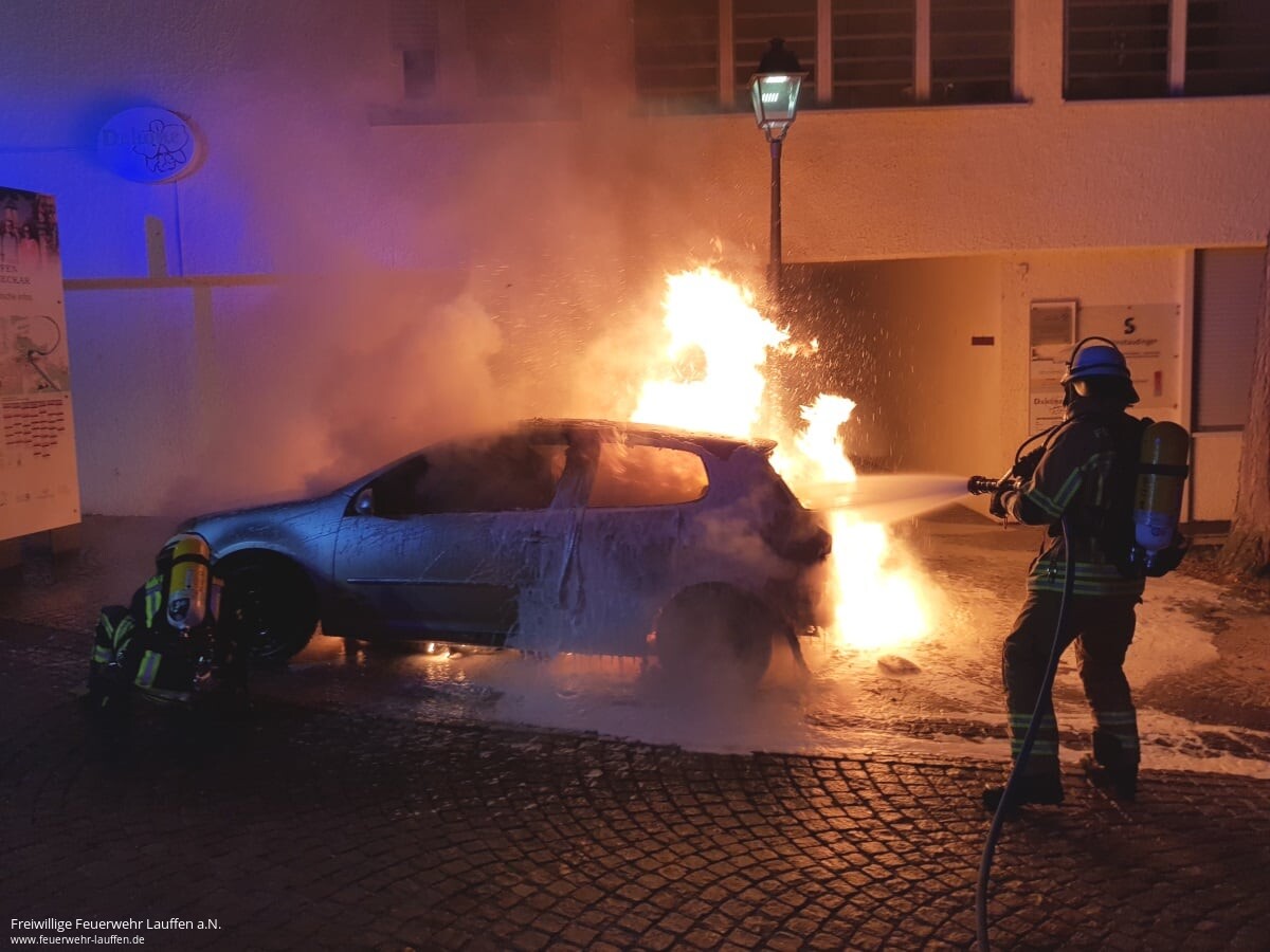 Schon bei der Anfahrt über die Alte Neckarbrücke ins „Städtle“ konnte von den Einsatzkräften ein PKW in Vollbrand erkannt werden. Kurz nach dem Brückenkopf der Neckarbrücke konnte ein auf einem Parkplatz abgestellter PKW angetroffen werden, welcher in voller Ausdehnung vom Feuer beaufschlagt war und unter welchem brennender Kraftstoff ausgetreten ist. Erschwerend kam hier noch hinzu, dass das KFZ ziemlich nahe an der Hauswand eines Mehrfamilien- und Ärztehaus geparkt war.