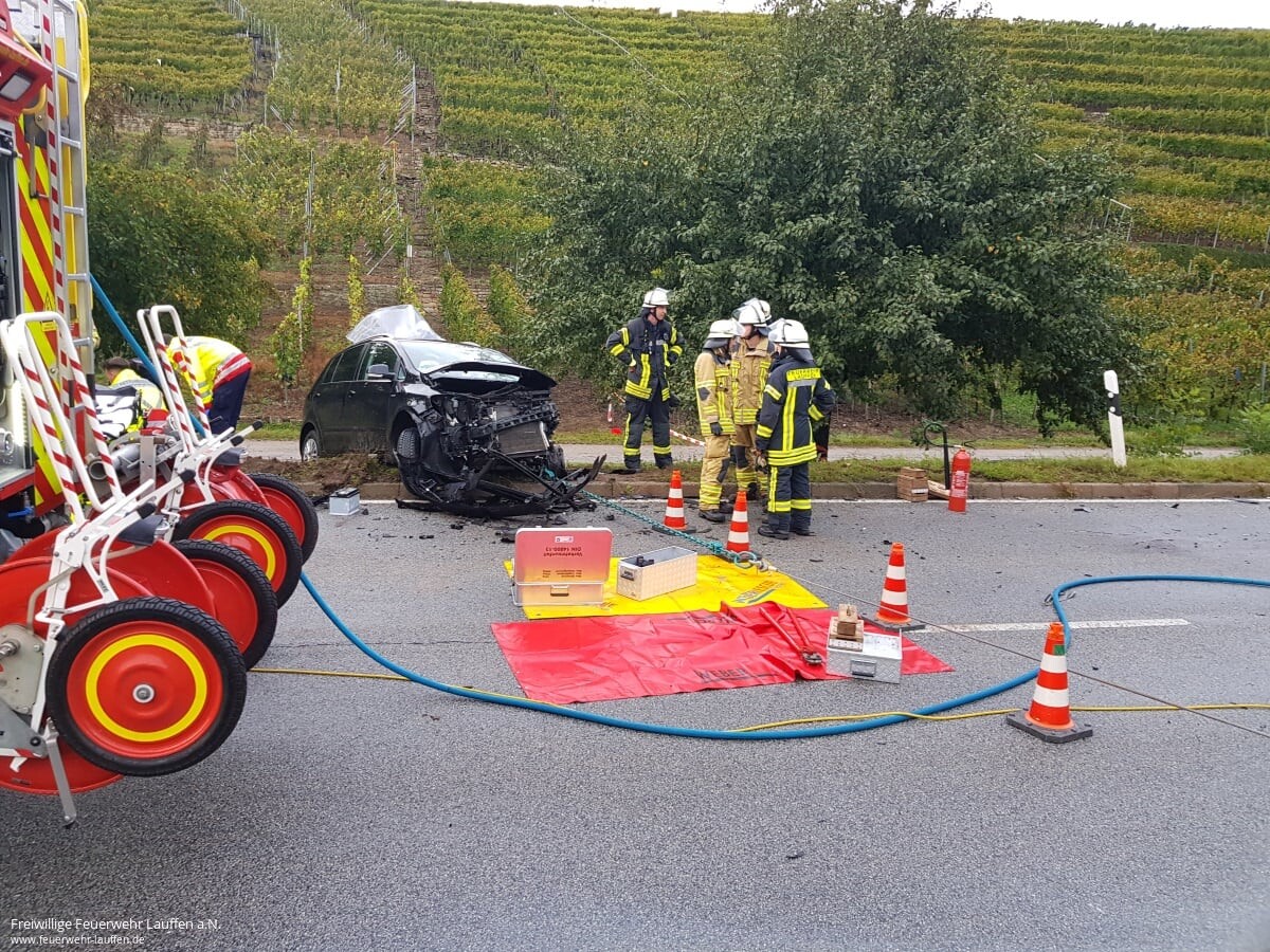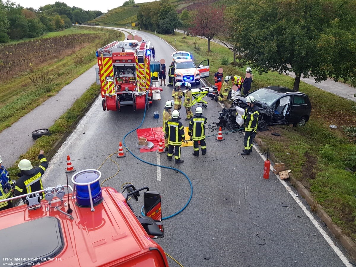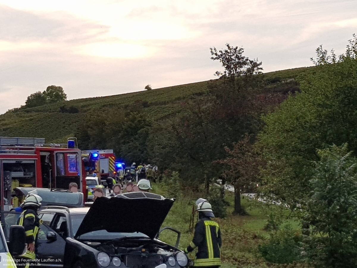 Nach einer Alarmierung zu einem Objektalarm in der städtischen Anschlussunterbingungsunterkunft um 07:38 Uhr, einer weiteren Einsatzalarmierung des Gerätewagen Meßtechnik um 13:15 Uhr nach Brackenheim, wurde die Feuerwehr Lauffen mit dem Alarmstichwort „VU PKW, 1 Person eingeklemmt“ um 18:12 Uhr zum dritten Einsatz an diesem Tag alarmiert.