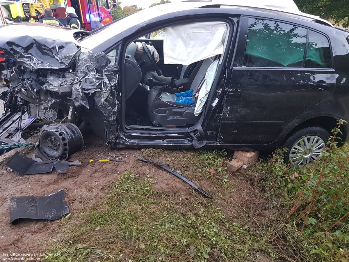 Beim Eintreffen an der Einsatzstelle wurden die drei verletzten Personen bereits durch Ersthelfer betreut und behandelt. Die beiden verunfallten Fahrzeuge standen in einem Abstand von rund 100 Meter entfernt und die L 1103 war hier mit Fahrzeug- und Trümmerteilen übersät. Die Unfallstelle wurde durch die Feuerwehr abgesichert und der Brandschutz sichergestellt.
