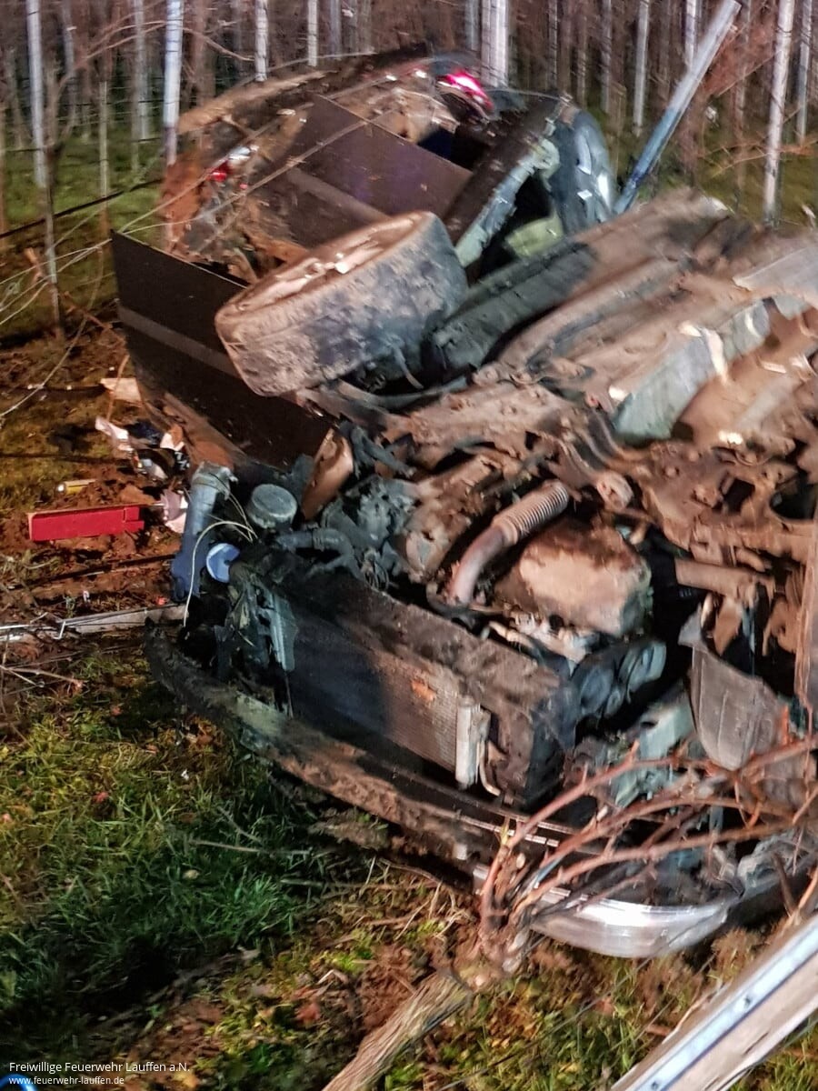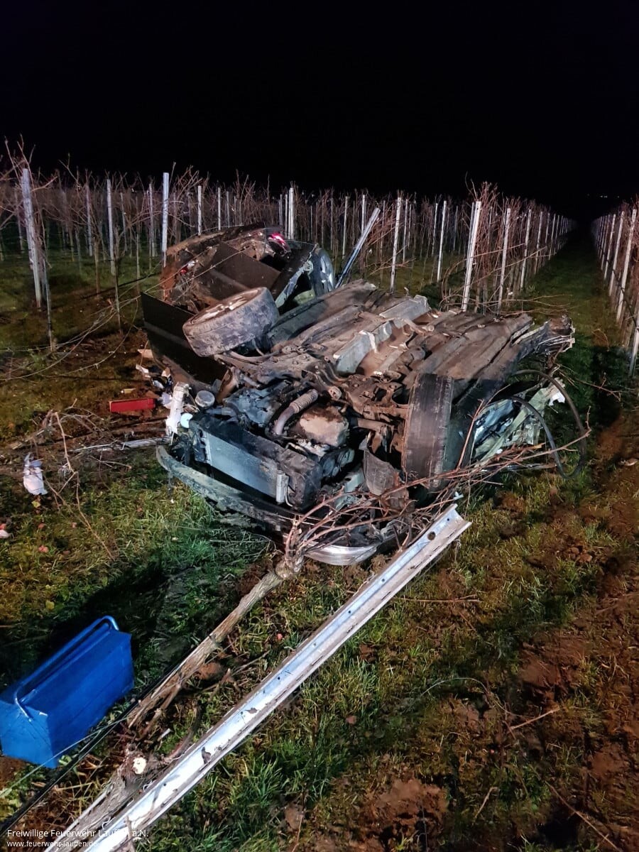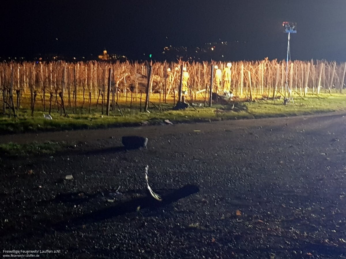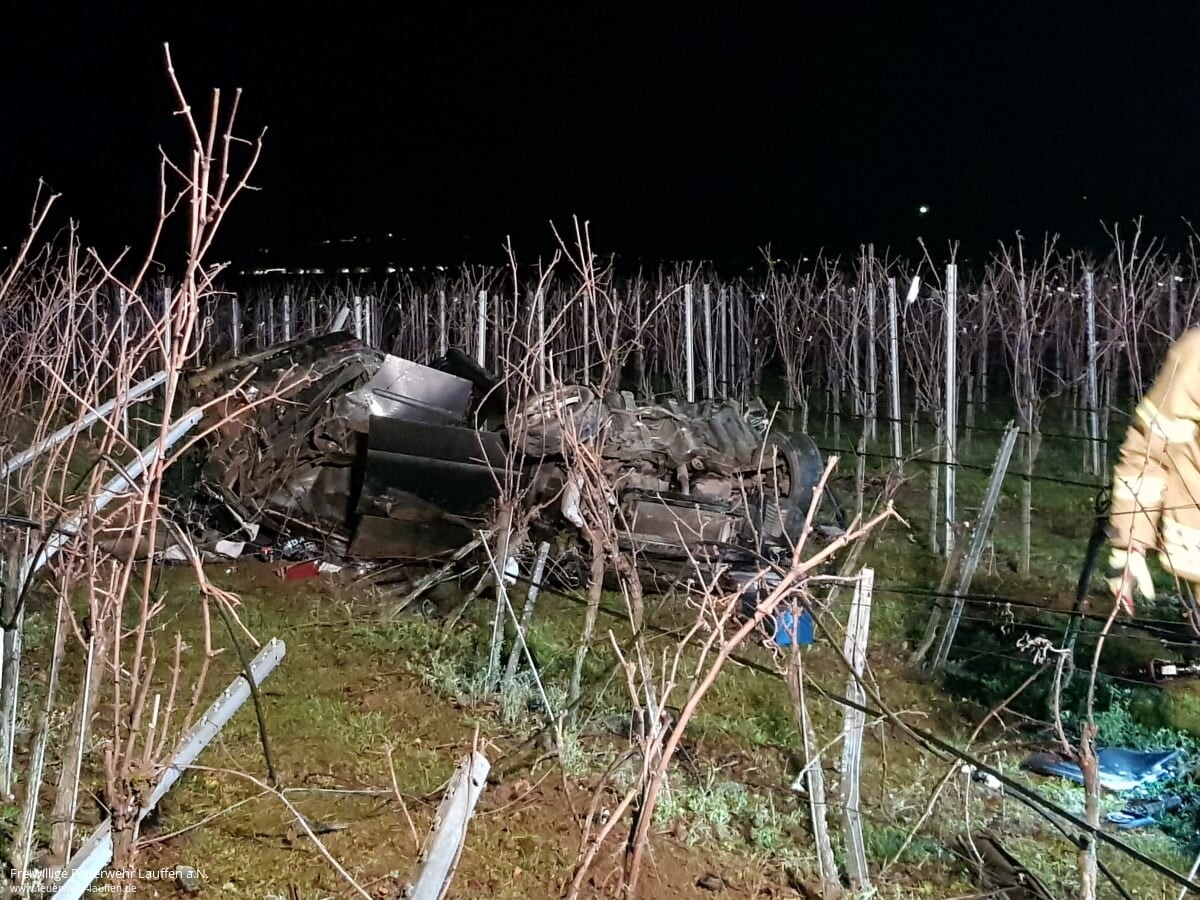 Noch unklar sind die Umstände dafür, dass ein aus Fahrtrichtung Ilsfeld kommender PKW auf Höhe des Parkplatz „Römischer Gutshof“ in Lauffen a.N. von der Fahrbahn der L 1105 abgekommen und schließlich massiv zerstört in einem Weinberg auf dem Dach liegend gelandet ist.