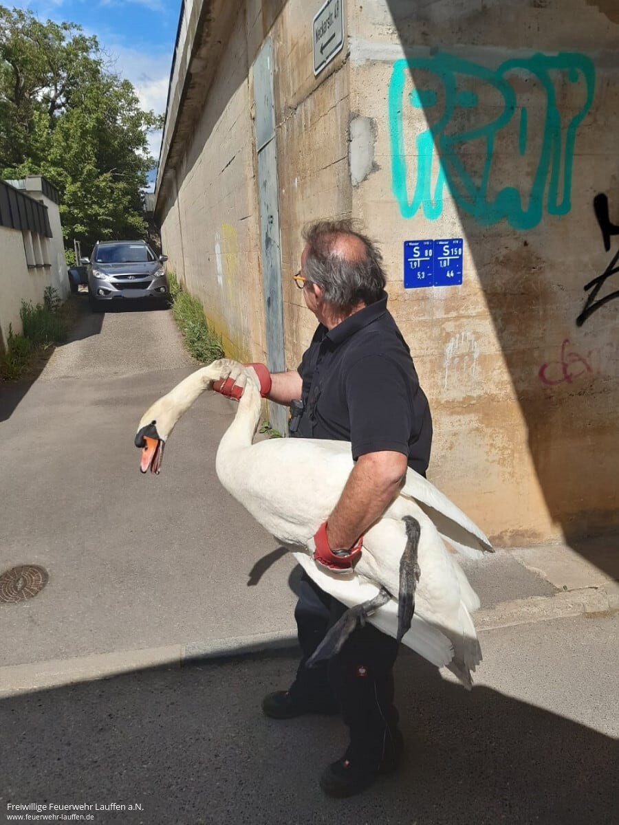 An der Einsatzstelle eingetroffen stellte es sich heraus, dass der Schwan wegen dem doritgen schmalen Weg nicht mehr zum Abflug starten konnte und notgedrungen durch die Gegend gewatschelt ist. Von der Feuerwehr wurde der Schwan aufgenommen und im Neckarunterwasser wieder freigelassen, wo er sich dann auch gleich wieder entfalten konnte.