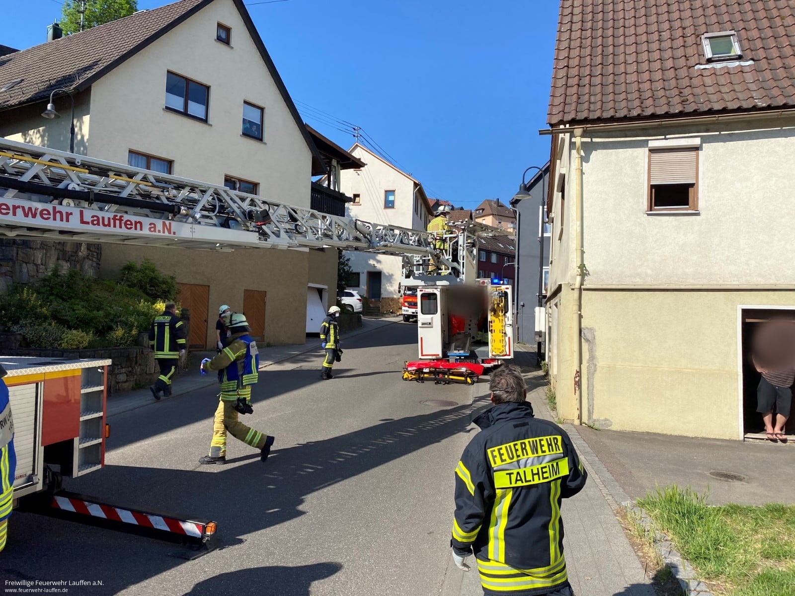 Nachdem der Patient durch den Notarzt und den Rettungsdienst transportfähig stabilisiert wurde, musste der Patient zum Rettungswagen verbracht werden. Da es sich um ein enges Treppenhaus handelte wurde die Drehleiter der Feuerwehr Lauffen am Neckar parallel mit der Feuerwehr Talheim mitalarmiert. Unter ständiger Überwachung durch den Notarzt wurde der Patient in der Schleifkorbtrage mittels der Drehleiter auf Straßenniveau gehoben und dort dann auf die Trage des Rettungswagens umgelagert. Der Patient wurde anschließend zur weiteren Versorgung ins Krankenhaus gebracht.