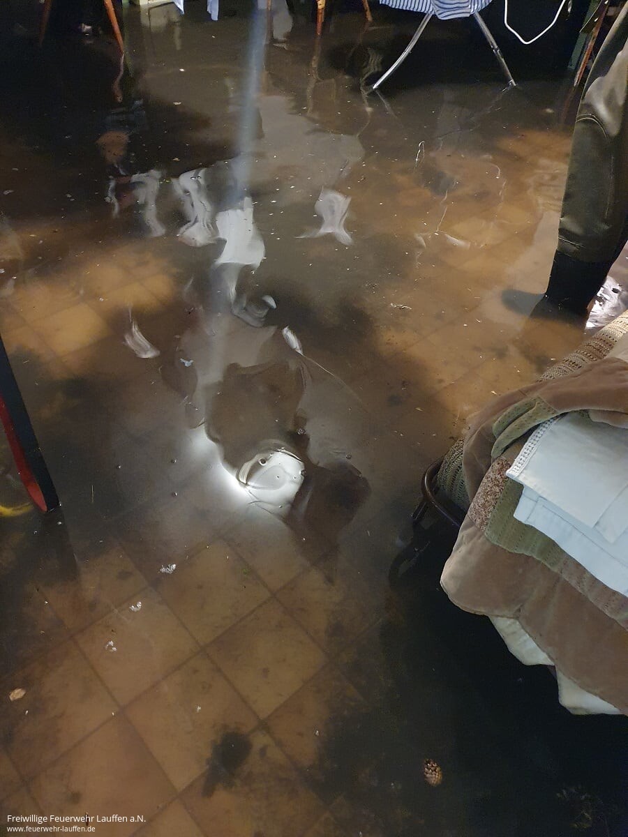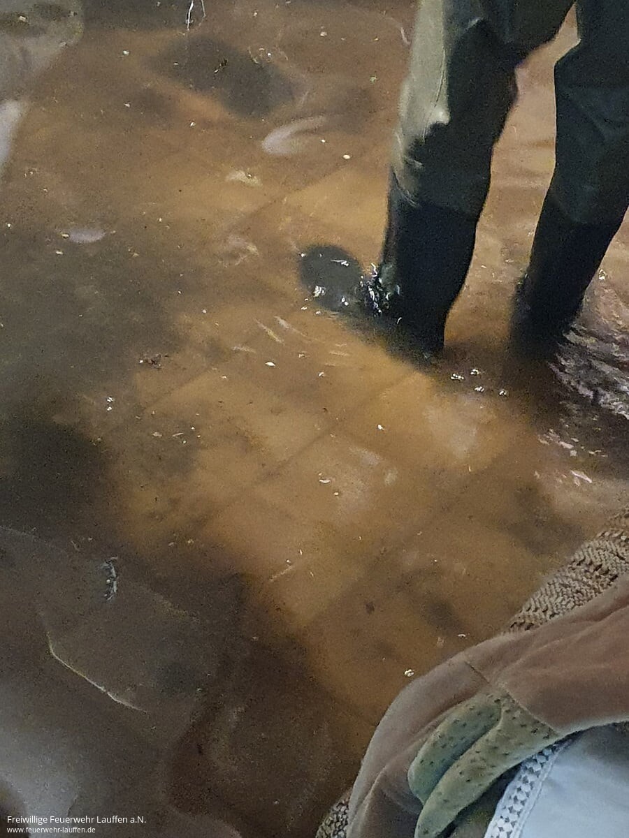 Wie so oft, war es auch hier wieder so, dass in einigen Fällen beim Eintreffen der Feuerwehr das Wasser aus dem Keller bereits wieder über den Ablaufschacht von selbst abgelaufen war. In einem Fall in der Jahnstraße jedoch, stand das gesamte Kellergeschoss teilweise bis zu 30 cm unter Wasser. Mit einer Watthose ausgerüstet, konnte durch die Feuerwehr händisch der Kellerabfluss von angeschwämmten Material befreit uns somit für den Abfluss des Wassers gesorgt werden.