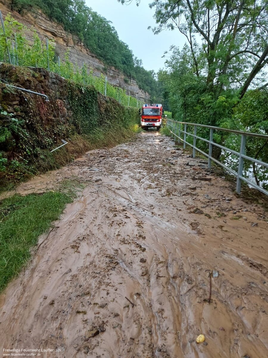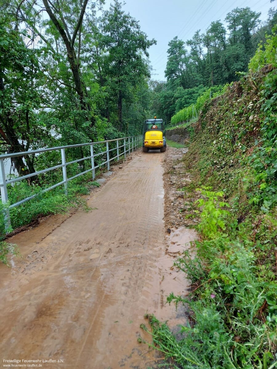 Aber auch den von Lauffen nach Heilbronn führenden Neckartalradweg hat das Starkregenereignis getroffen. Durch die vom Hang herabströmenden Wassermassen haben Schlamm und Geröll mitgerissen, was den Neckartalradweg kurzzeitig unbenutzbar machte. Durch die Feuerwehr wurde mit Unterstützung des Radlader der Stadt Lauffen der Neckartalradweg wieder befahrbar gemacht.