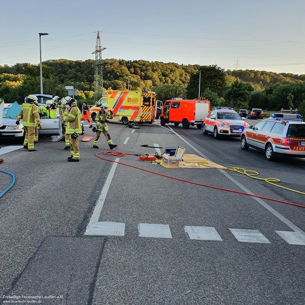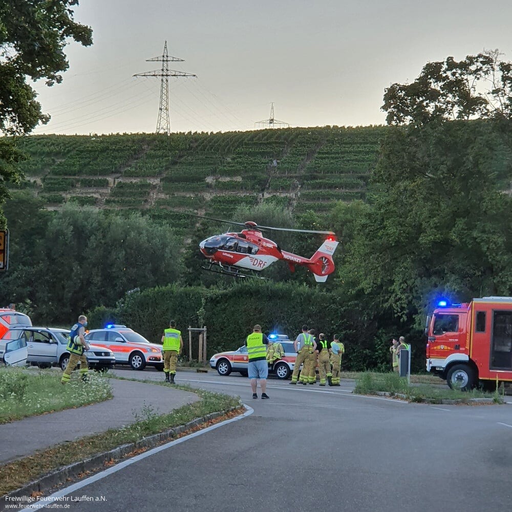Zu einem schweren Verkehrsunfall zwischen einem Radfahrer und einem PKW wurden die Rettungskräfte in den frühen Abendstunden auf die L 1103 zwischen Lauffen und Meimsheim alarmiert. Dort ist es vermutlich im Bereich der Radquerung beim Umspannwerk zu einer Kollision zwischen dem Radfahrer und einem aus Richtung Meimsheim kommenden PKW gekommen.