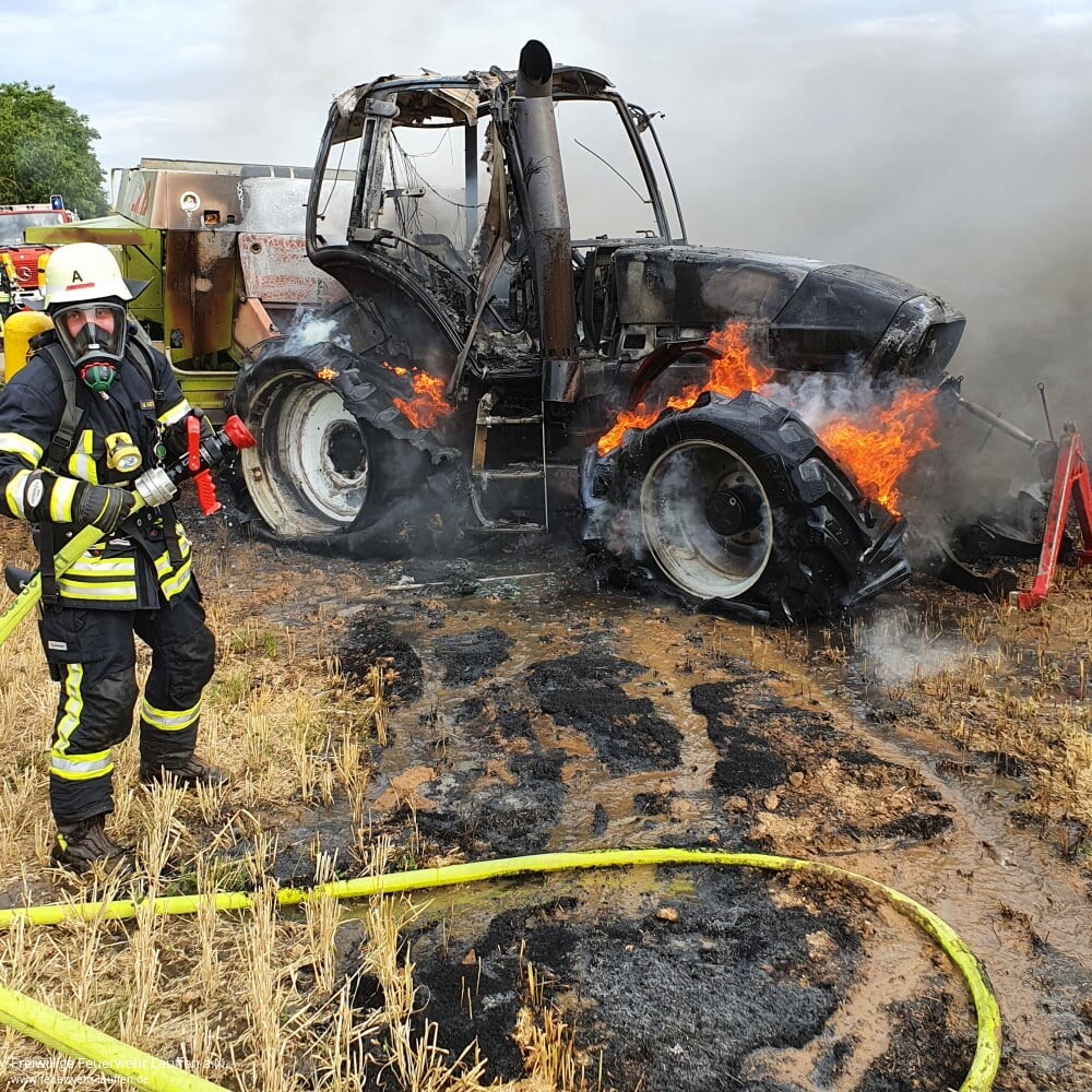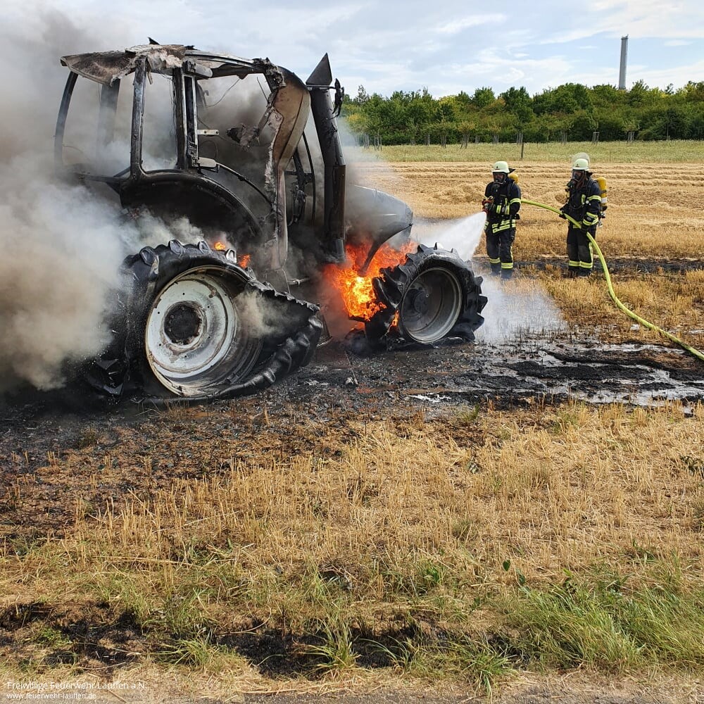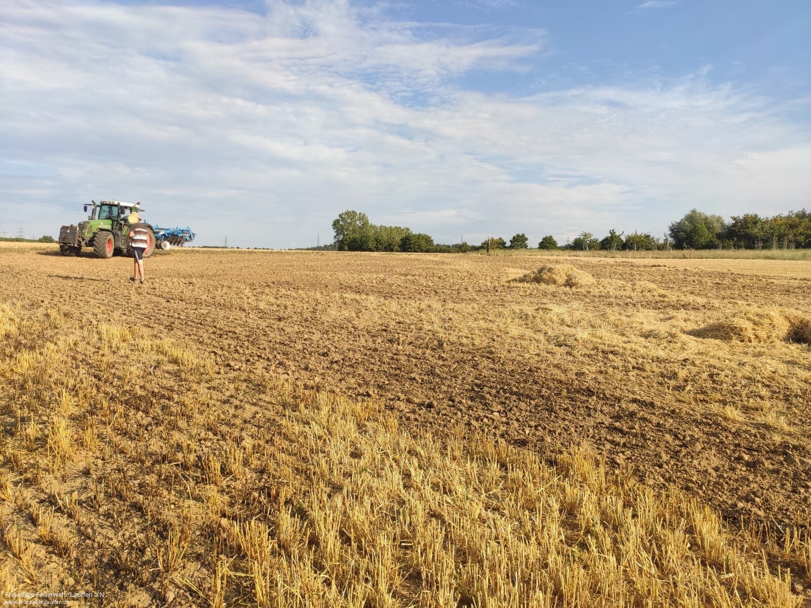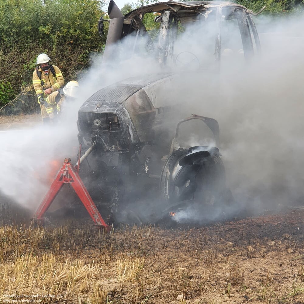 Die Feuerwehren Neckarwestheim und Lauffen wurden zu einem LKW-Brand auf ein Feld im Auweg alarmiert. Vor Ort stellte sich der LKW-Brand als ein Brand eines landwirtschaftlichen Gespanns auf einem abgeernteten Getreidefeld dar. Der Fahrer konnte sich rechtzeitig in Sicherheit bringen. Der Brand hatte sich bereits großflächig auf dem Feld ausgebreitet. Daraufhin wurden über die Leitstelle sofort zwei weitere Löschfahrzeuge zur Wasserversorgung an die Einsatzstelle nachalarmiert. Zwei Landwirte mit einem Grubber und einer Scheibenegge waren ebenfalls bereits auf Anfahrt.