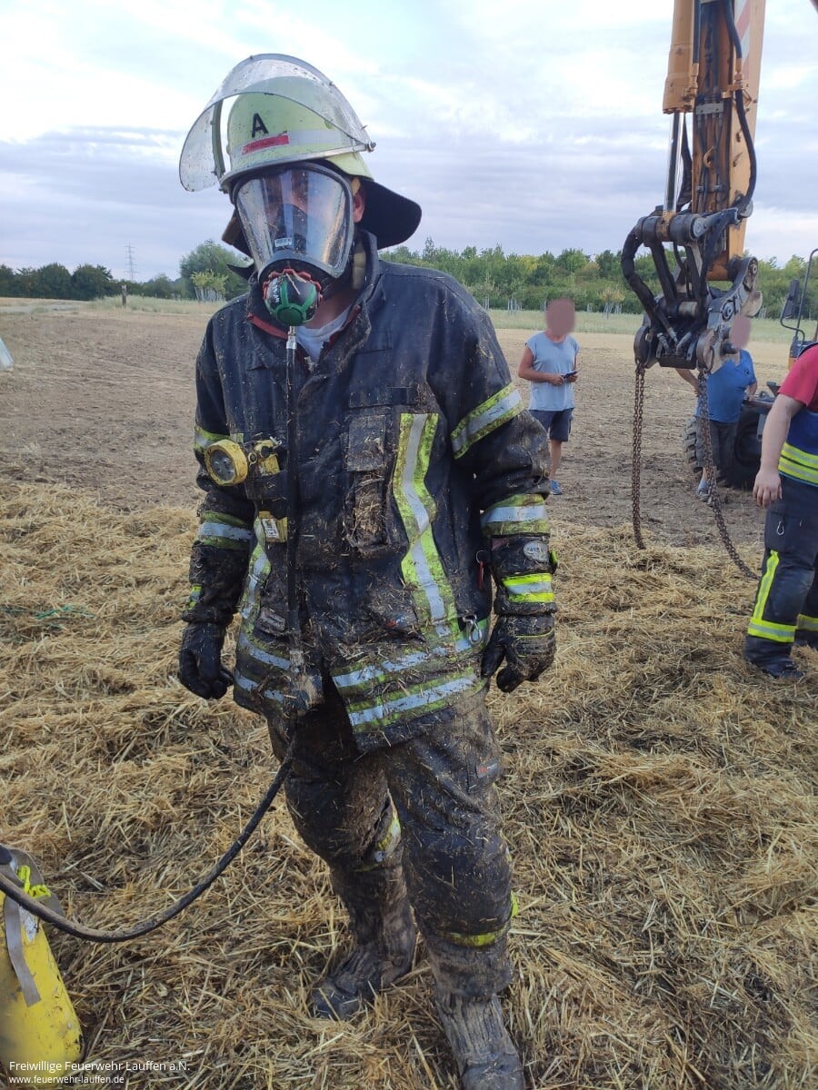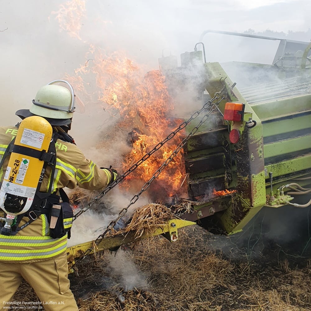 Das Löschen des Traktors und der Ballenpresse konnte anschließend mit der Zugabe von Netzmittel unter schwerem Atemschutz durchgeführt werden. Die Nachlöscharbeiten zogen sich dann noch über 3 Stunden hin, bis auch das letzte Glutnest im Stroh in der Ballenpresse gefunden und gelöscht war. Aufgrund der sommerlichen Hitze wurde das Personal rotiert und Pausen eingelegt. Anschließend kümmerte sich der Fahrer des Gespanns um dessen Abtransport sowie um die Aufnahme des kontaminierten Erdreichs.