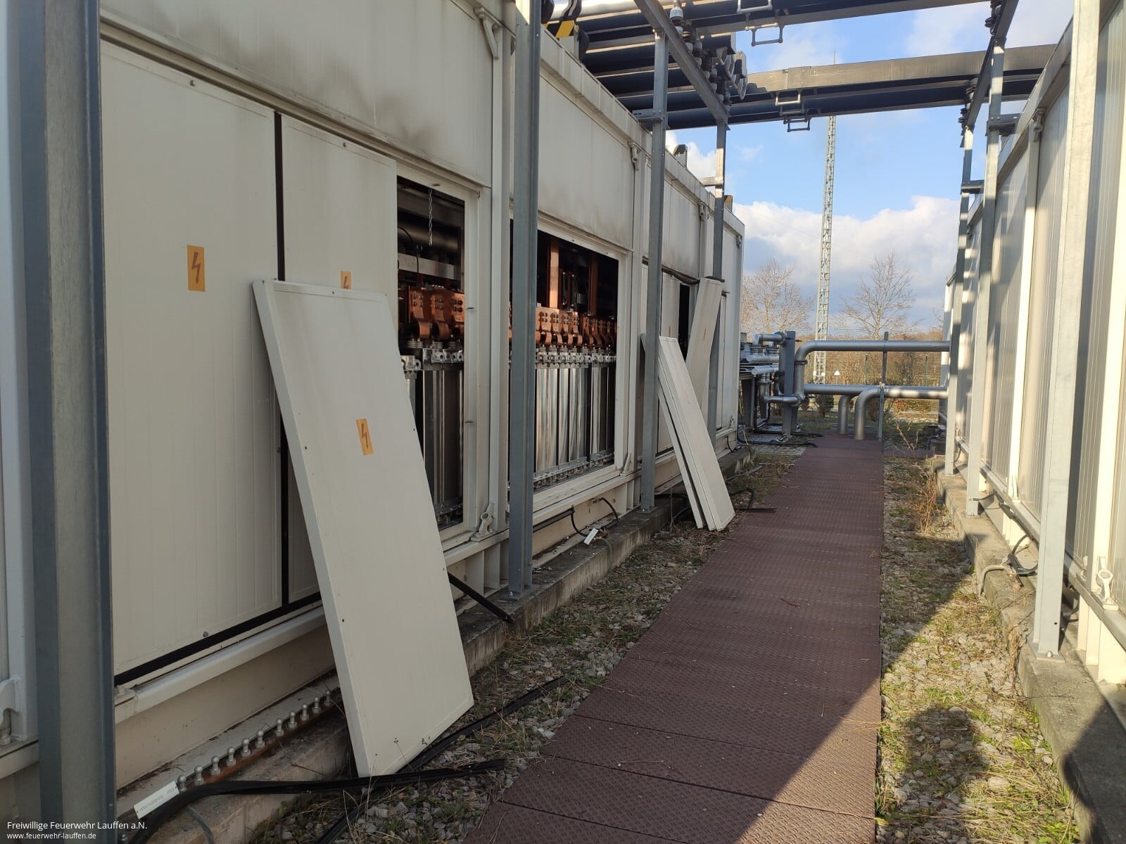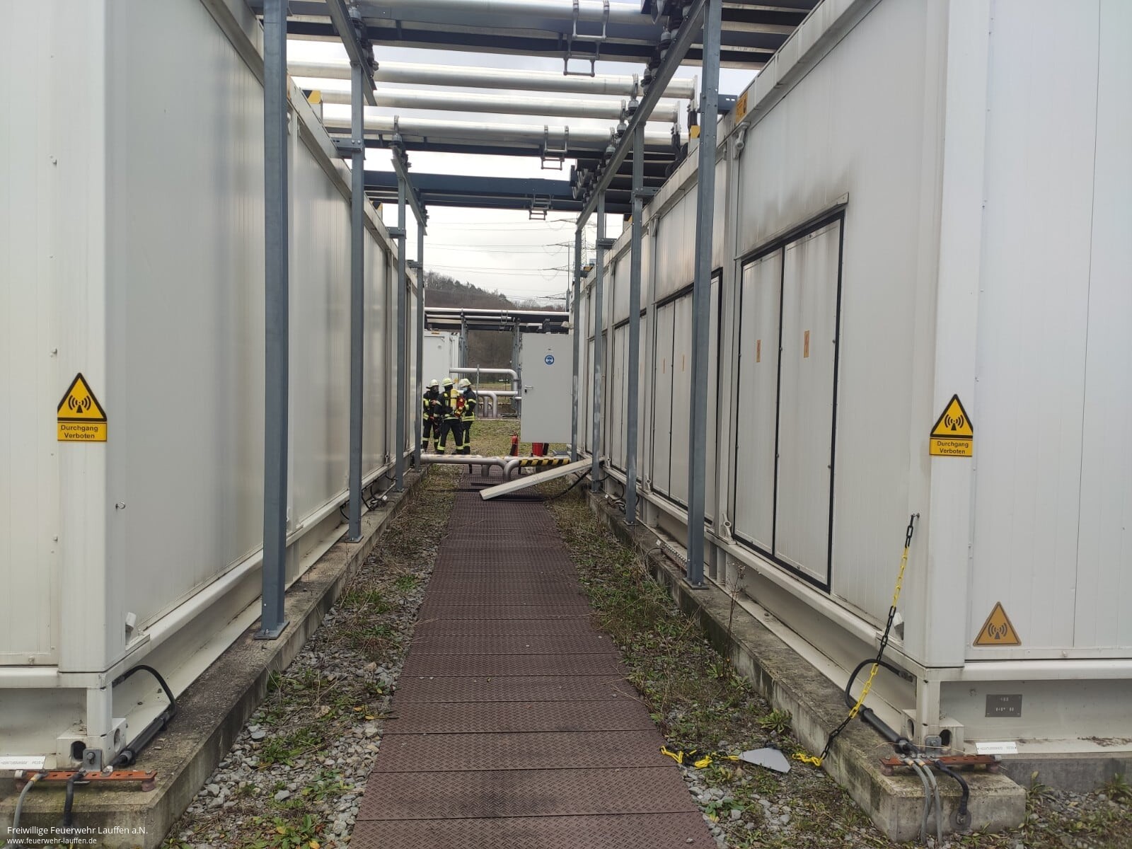 Die Rauchentwicklung wurde durchgehend beobachtet und währenddessen vor dem Zugang zum Gelände die Wasserversorgung aus dem Löschwasserbehälter aufgebaut. Von der Werkfeuerwehr GKN wurden weitere CO²-Feuerlöscher angefordert. Als der Notfallmanager den Zugang ermöglichte und die betroffene Anlage freigeschalten hatte, wurde die Erkundung auf dem Gelände fortgesetzt. Dabei wurde ein explodierter elektrischer Kondensator in einem der Umrichtercontainer festgestellt. Durch die Explosion des etwa 1 m hohen Kondensatorbehälters wurden die Wände des Containers herausgedrückt. Ein ähnliches Bild bot sich den Kräften bereits vor drei Jahren bei einem Einsatz an ähnlicher Stelle.