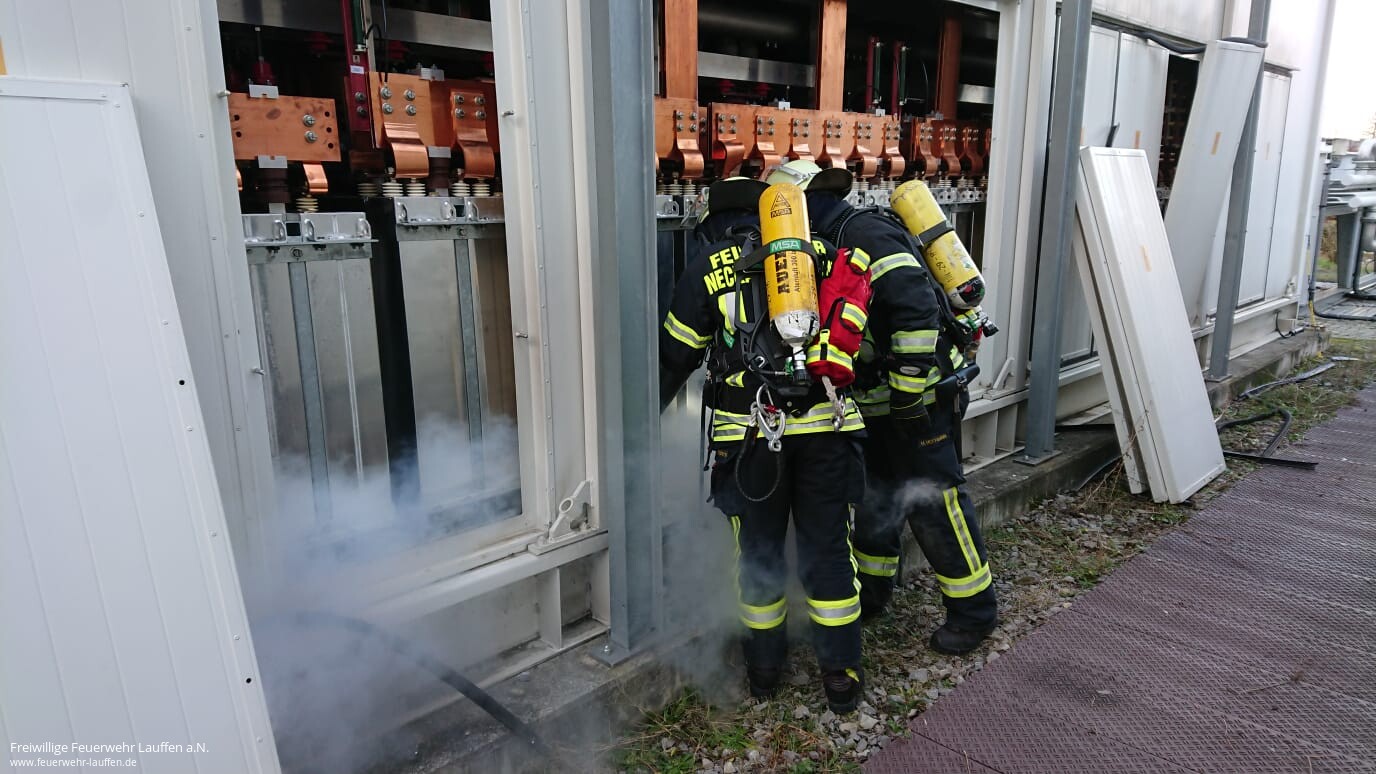 Die Feuerwehren Neckarwestheim und Lauffen wurden zu einem Brand in elektrischen Anlagen zum DB Bahnstromumrichter alarmiert. Da der Notfallmanager eine längere Anfahrt hatte, wurde das Gelände von Außen erkundet. Dabei wurde eine Rauchentwicklung in einem der beiden Umrichterbereiche festgestellt. Offenes Feuer war keines sichtbar und das Umrichterwerk ist auch nicht ständig von Personal besetzt, sodass erstmal keine Gefahr für Personen oder Brandausbreitung bestand.
