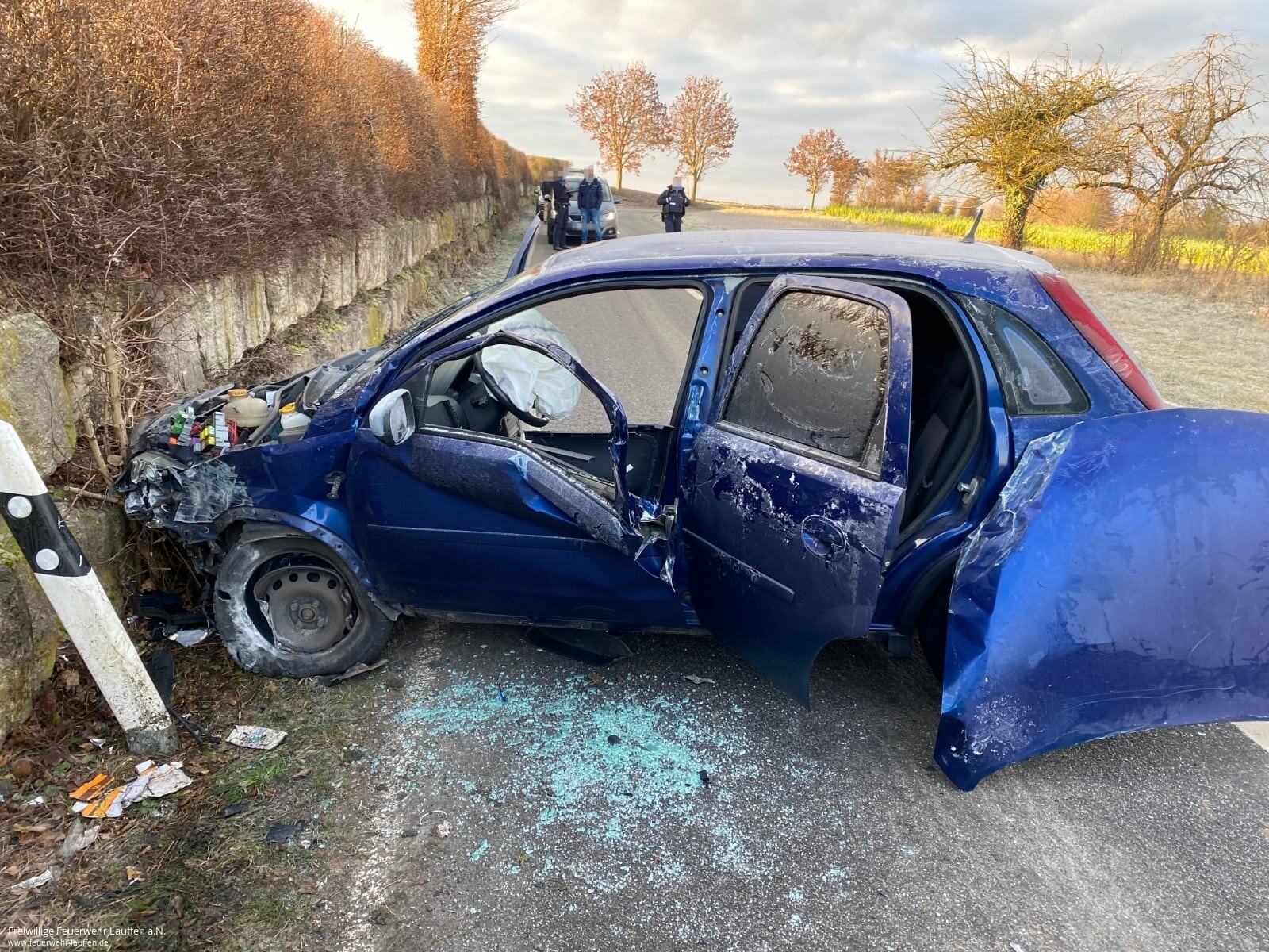 Der Fahrer eines Opel kam von seiner Spur ab und prallte gegen die Mauer seitlich der Fahrbahn, er wurde in seinem Fahrzeug eingeschlossen. Ein Ersthelfer versorgte Ihn bis zum Eintreffen der Rettungskräfte vorbildlich.