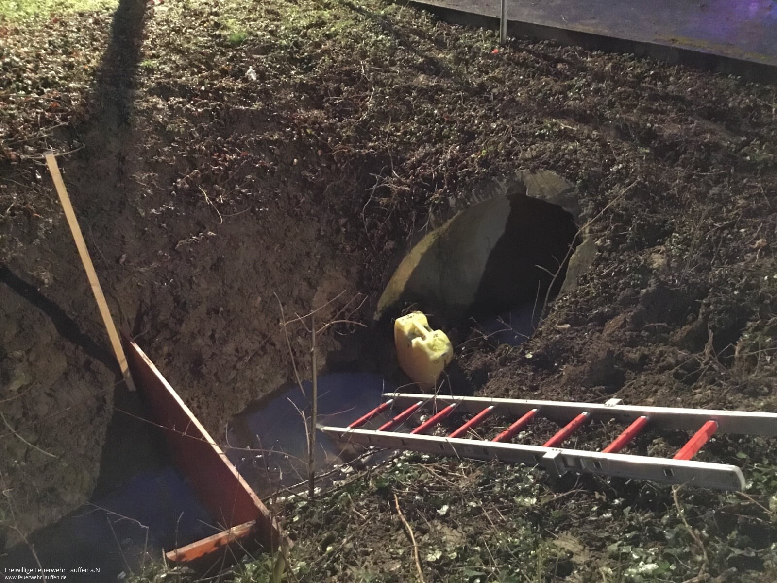 Am Mittwochabend entdeckten Spaziergänger entlang des Leinbachs, dass in einem Zulauf zum Leinbach das Wasser trüb und milchig war. Um eventuelle Umweltschäden zu vermeiden wurde die Feuerwehr alarmiert. Diese installierte im ersten Schritt einen Damm, um den weiteren Zufluss des verunreinigten Wassers zum Leinbach zu stoppen. Umgehend wurde die Ursachenanalyse gestartet. Parallel wurde die Feuerwehr Lauffen alarmiert. Mit deren Gerätewagen Messtechnik (GW-Mess) wurden erste Wasserproben entnommen und bspw. auf den PH-Wert analysiert. Zur weiteren fachlichen Unterstützung wurde der Fachberater Chemie angefordert. Dieser wurde durch die Feuerwehr Bad Friedrichshall zur Einsatzstelle gebracht, da der Berater in Bad Friedrichshall ansässig ist. Weiter waren sowohl der Kreisbrandmeister, dessen Stellvertreter sowie das Landratsamt und die Polizei Heilbronn am Einsatzort anwesend. Da während des Einsatzverlaufes die Verunreinigung nicht identifiziert werden konnte wurde eine Fachfirma mit der Absaugung des verunreinigten Wassers beauftragt. Nach Abschluss der Absaugung wurde der Kanal nochmals gespült um etwaige Reste der Verunreinigung zu entfernen. Als keine weitere Verunreinigung mehr gefunden werden konnte wurde der Damm wieder geöffnet. Nach den Aufräumarbeiten konnte der Einsatz für alle Beteiligten beendet werden.