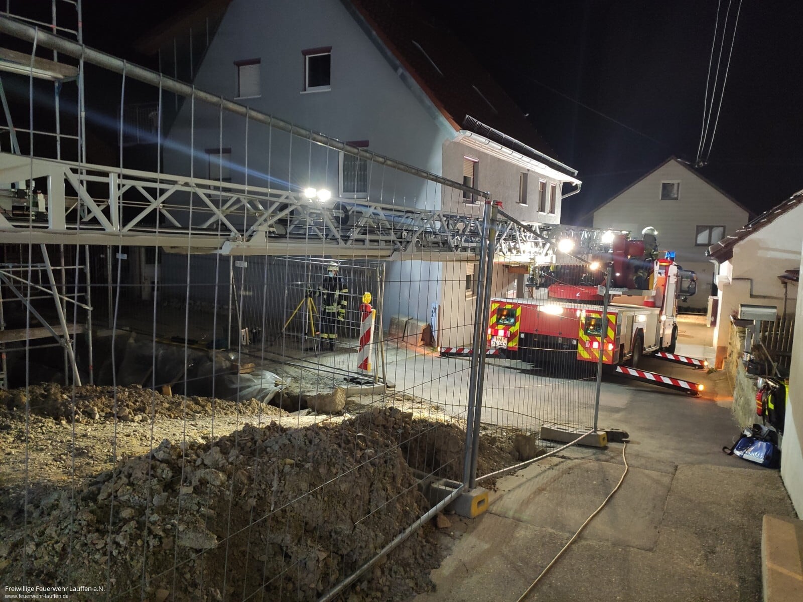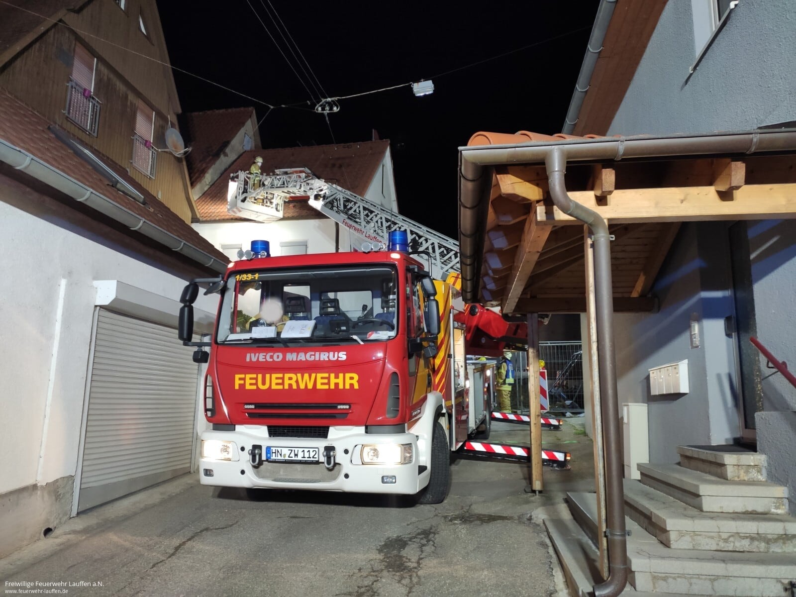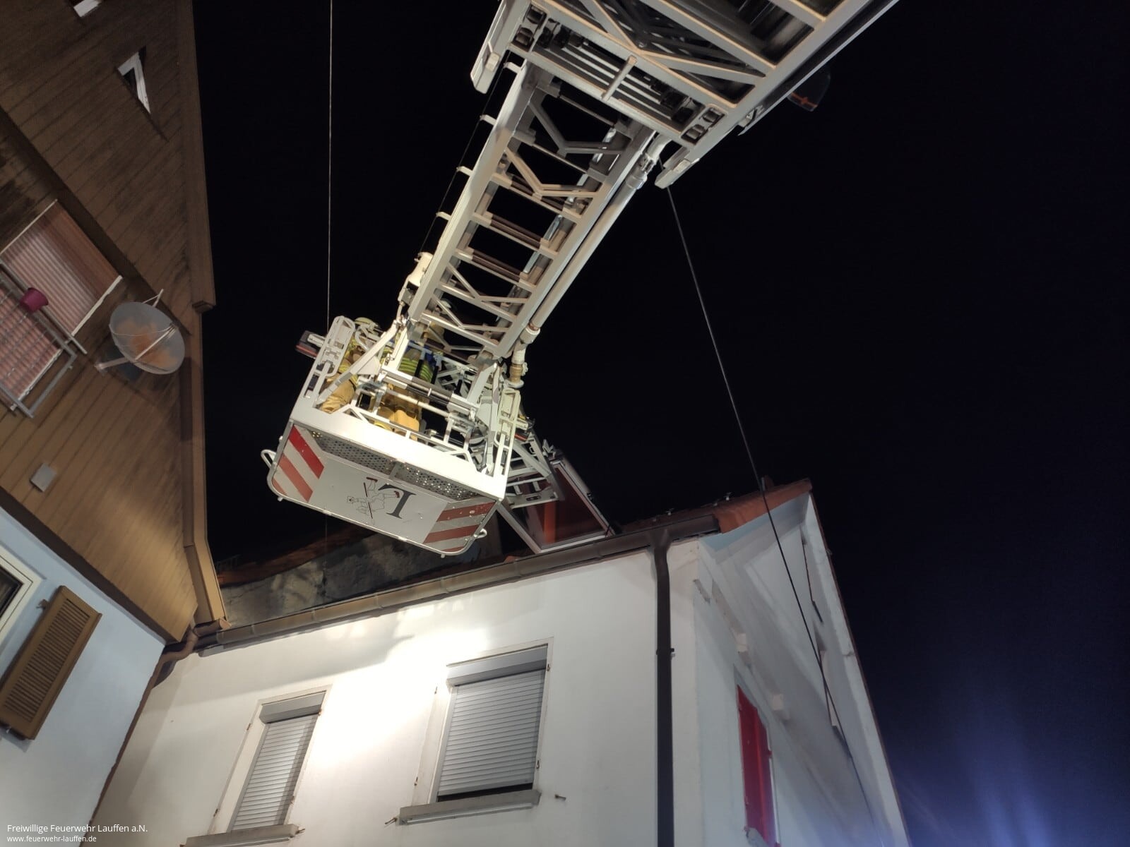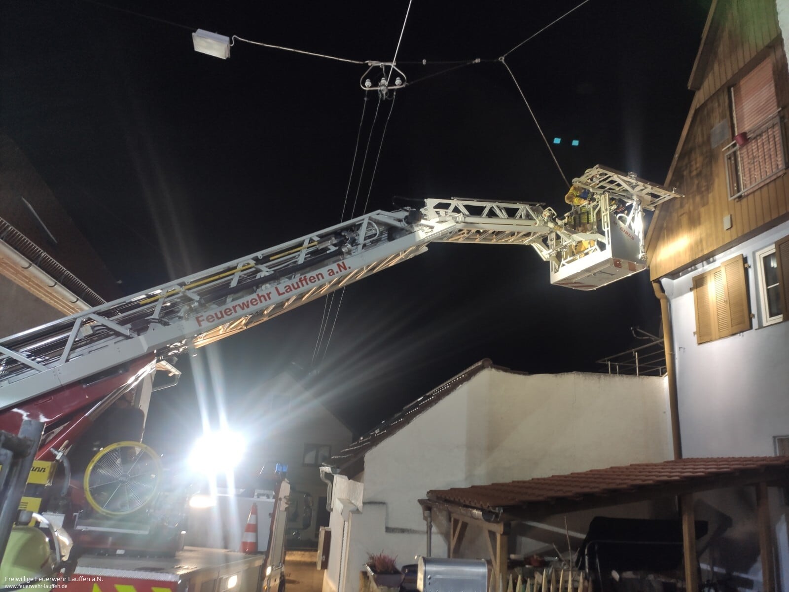 Aufgrund der Enge des Treppenhauses des alten Gebäudes war dies nicht per Trage oder Tragestuhl möglich. Jedoch gestaltete sich auch die Stellplatzsuche für die Drehleiter herausfordernd, da sich im 2. OG, welches eigentlich bereits das erste Dachgeschoss ist, nur ein zugängliches und größeres Fenster befindet. Die einzige Möglichkeit bestand daher in einer Zufahrt von der Rückseite des Gebäudes von einer Parallelstraße aus, wobei genau in diesem Bereich eine unisolierte Freileitung der Straßenbeleuchtung verläuft.