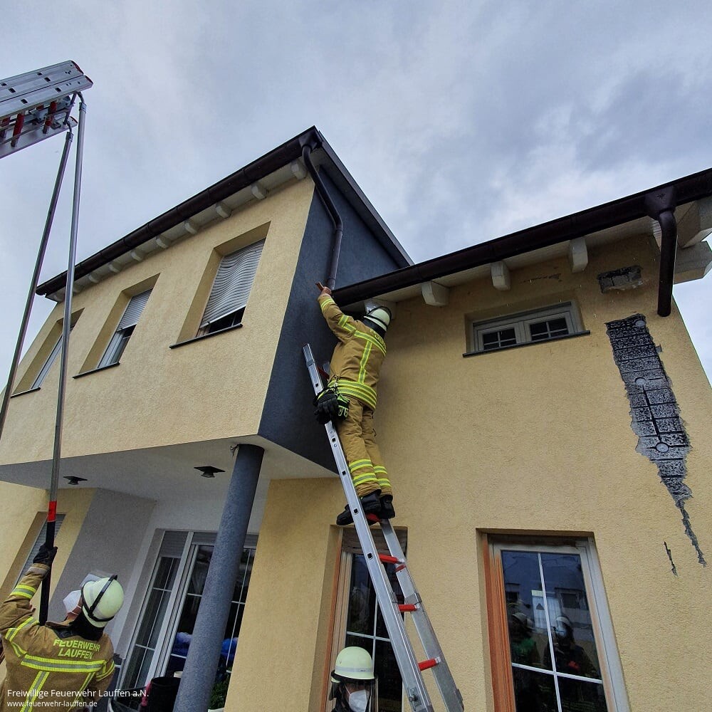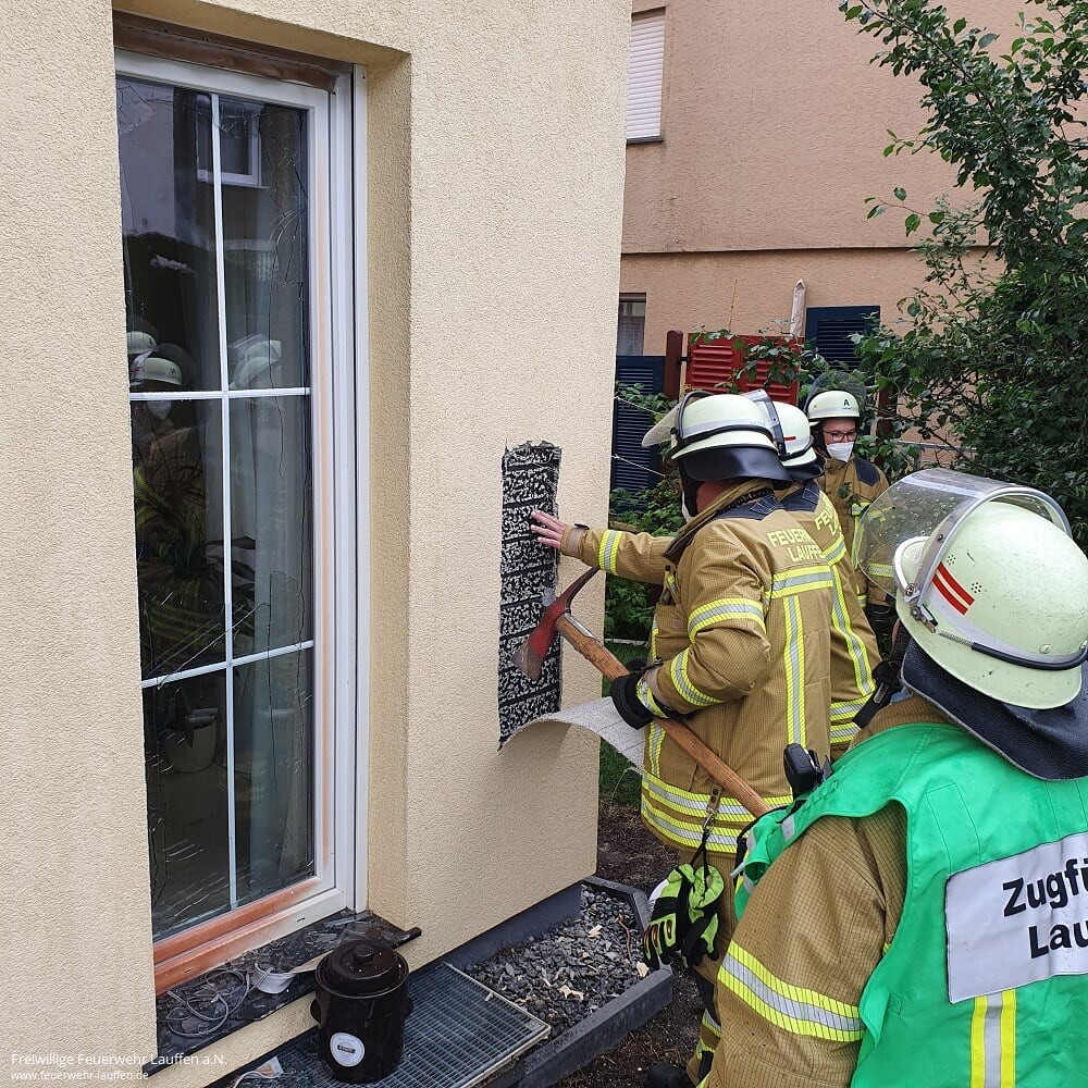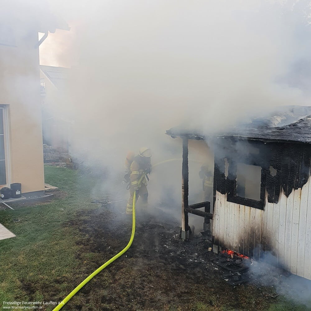 An der Einsatzstelle eingetroffen stand brannte ein Gartenhaus im Garten eines Wohngebäudes bereits in voller Ausdehnung. Durch zwei Trupps unter Atemschutz wurden C-Rohre vorgenommen und unmittelbar massive Löscharbeiten und eine Riegelstellung eingeleitet. Der Hitzeaufschlag um die Gartenhütte war so hoch, dass an den umliegenden Gebäuden verschiedene Fensterscheiben gesprungen sind. Am Wohngebäude sind die Rolläden angeschmolzen und auch die Fassadenverkleidung wurde in Mitleidenschaft gezogen. Um hier einen Brandausbruch am Wohngebäude ausschließen zu können, wurde die Gebäudefassade punktuell geöffent und mit einer Wärmebildkamera kontrolliert.