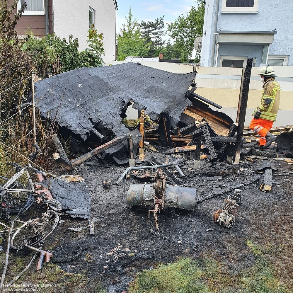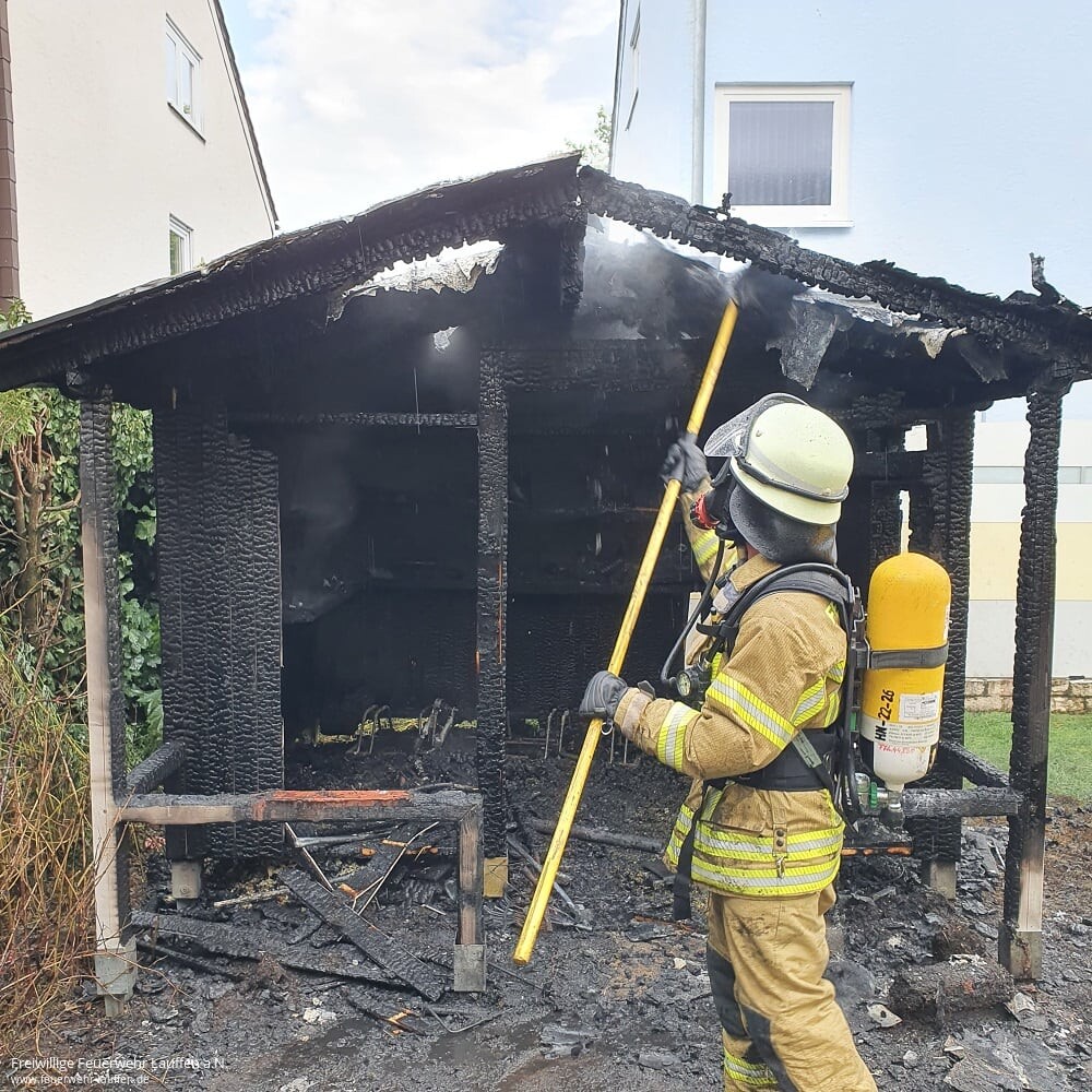 Trotz der schnell eingeleiteten massiven Löschmaßnahmen konnte ein Totalschaden am Gartenhaus leider nicht vermieden werden. Um alle Glutnester ablöschen zu können mussten die Reste des Gartenhaus unter Einsatz einer Motorkettensäge aufgesägt werden.
