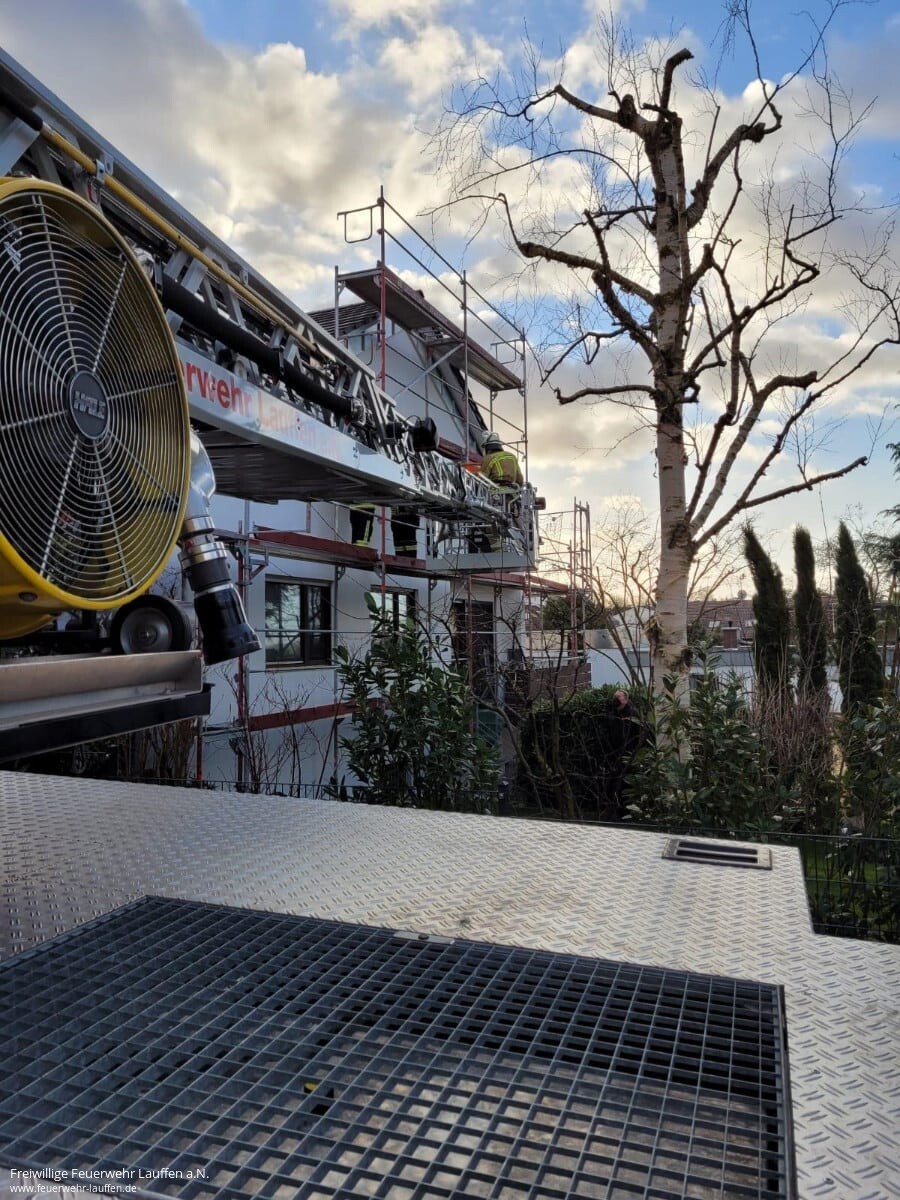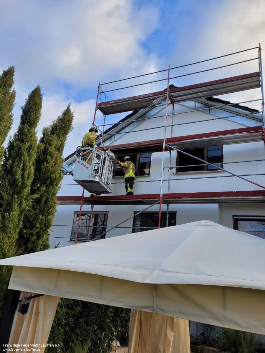 Da das Gebäude aktuell eingerüstet ist, musstem durch die Feuerwehr Talheim im Vorfeld teile der Gerüstsicherung umgebaut sowie Teile der Absturzsicherung teilweise entfernt werden. Nach der Rettung der Person über die DLK wurden die Sicherungselemente wieder wie im Ursprung angebracht.