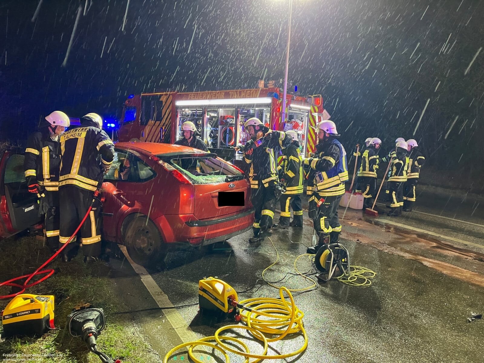 Der Fahrer des Ford befand sich noch in seinem PKW und wurde dort notärztlich vom Rettungsdienst versorgt. Durch die erlittenen Verletzungen wurde die Person in Absprache mit dem Notarzt durch die Feuerwehr befreit.