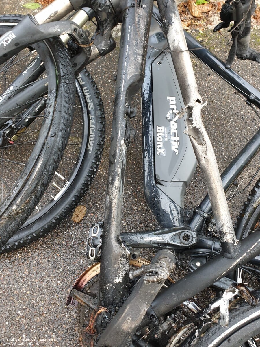 Wenige Minuten nach Eintreffen der ersten Einsatzkräfte und Erkundung ergab sich folgendes Bild: Der Akku eines E-Bikes hatte in einer Garage Feuer gefangen und bereits auf angrenzende Gegenstände übergegriffen. Der Bewohner hatte erste Löschmaßnahmen mit einem Gartenschlauch vorgenommen, was eine weitere Ausbreitung auf das geparkte Fahrzeug und das Wohnhaus verhinderte. Weitere Personen befanden sich nicht mehr im Gebäude.