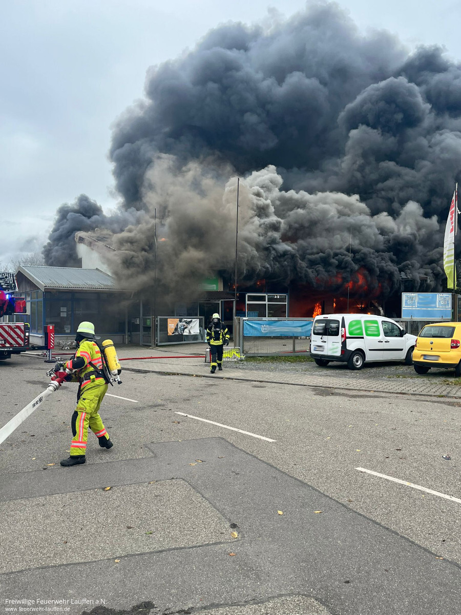 Die Feuerwehr Schwaigern wurde mit dem Einsatzstichwort „Brand gefährliche Stoffe“ in die „Tiergärten“ (Stetten) alarmiert. Bereits auf der Anfahrt war eine starke Rauchentwicklung erkennbar. Am Einsatzort eingetroffen stand die Halle einer Landmaschinen-Werkstatt bereits in Vollbrand. Umgehend wurden deshalb weitere Einsatzkräfte (Abteilungen Niederhofen & Massenbach sowie die Feuerwehren Leingarten, Massenbachhausen und Neckarsulm [Fernmeldegruppe]) nachalarmiert. Ebenfalls auf Anfahrt befanden sich die Feuerwehr Bad Rappenau (Gefahrgutzug) und die Feuerwehr Lauffen (GW-Mess).